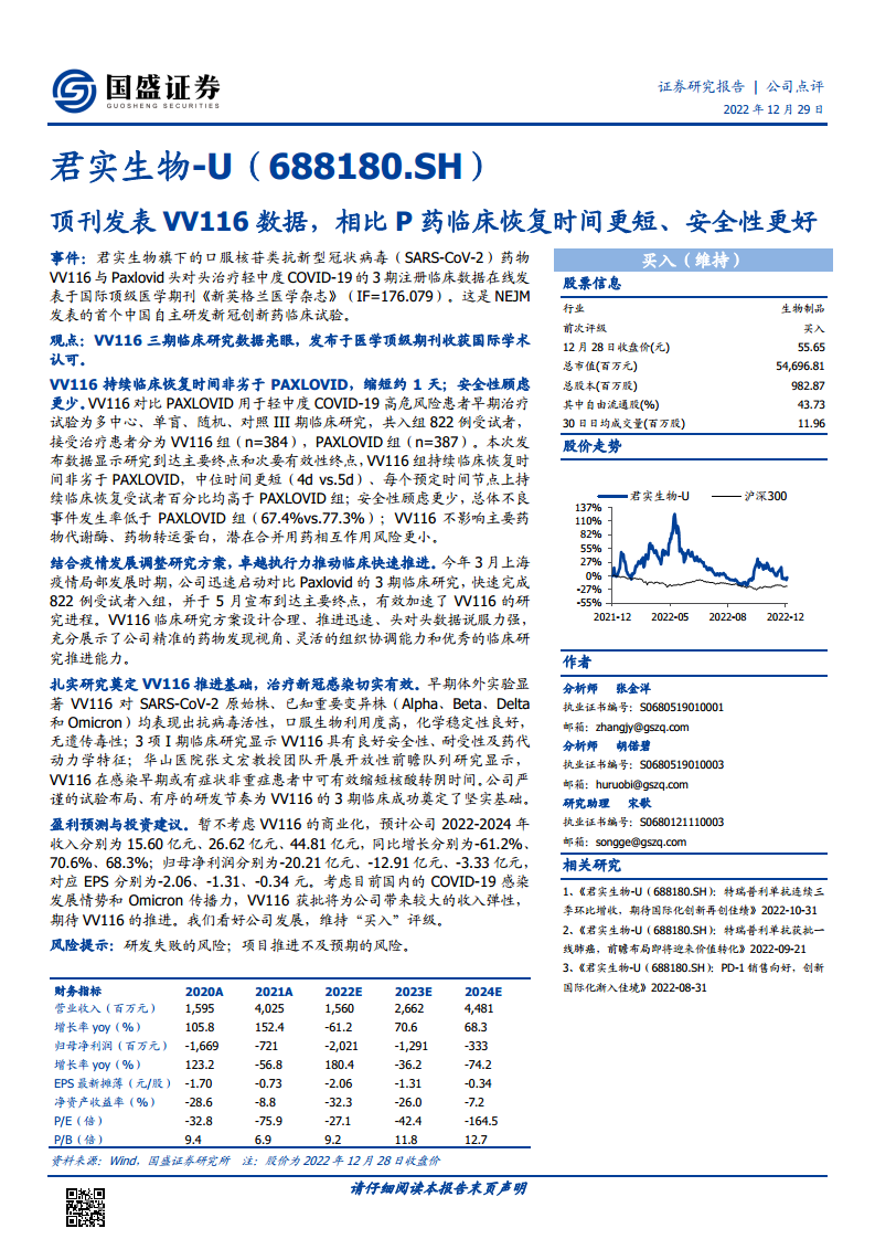 此次临床研究的成功发布,不仅彰显了君实生物在药物发现、临床研究推进和组织协调方面的卓越能力,也为VV116的商业化前景奠定了坚实基础。考虑到当前国内COVID-19感染发展情势和Omicron变异株的传播力,VV116一旦获批,预计将为公司带来显著的收入弹性。基于VV116的积极进展和市场潜力,国盛证券研究所维持对君实生物的“买入”评级,看好公司未来的发展。