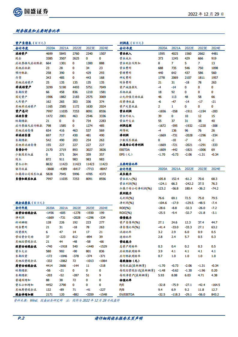 报告暂不考虑VV116的商业化收入,预计君实生物2022-2024年收入分别为15.60亿元、26.62亿元、44.81亿元,同比增长分别为-61.2%、70.6%、68.3%。归母净利润预计分别为-20.21亿元、-12.91亿元、-3.33亿元,对应EPS分别为-2.06、-1.31、-0.34元。考虑到目前国内的COVID-19感染发展情势和Omicron传播力,VV116获批将为公司带来较大的收入弹性,国盛证券研究所看好公司发展,维持“买入”评级。