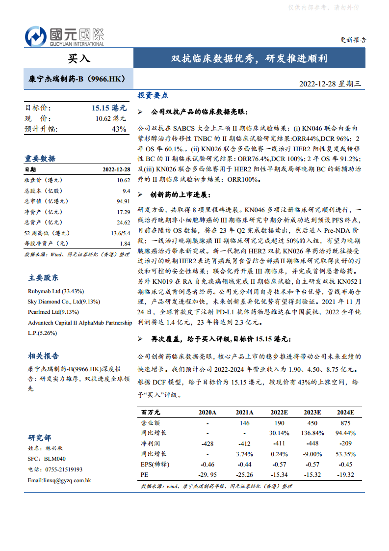 公司在创新药研发方面取得了8项里程碑进展,核心产品KN046和KN026的注册临床研究顺利进行,并有望在近期进入Pre-NDA阶段或完成关键数据读出。首款上市产品KN035(恩维达)已在中国获批,并贡献了可观的收入。随着更多创新产品的上市,公司收入预计将实现快速增长,盈利能力将显著提升。基于DCF模型,报告给予公司“买入”评级,目标价15.15港元,预计有43%的上涨空间。