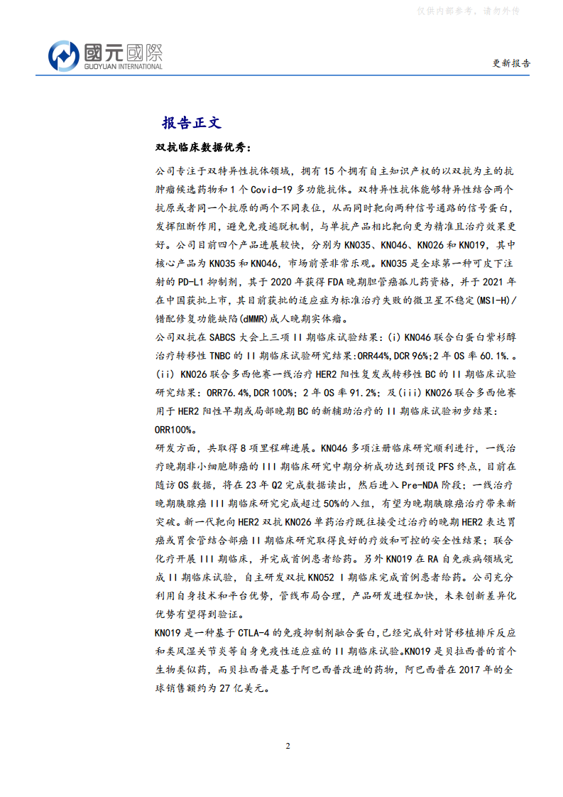 本报告核心观点指出,康宁杰瑞制药-B(9966.HK)的双特异性抗体产品在临床试验中展现出优异数据,研发进展顺利,为公司未来业绩增长奠定坚实基础。特别是KN046和KN026在多项肿瘤适应症的II期和III期临床试验中取得了显著疗效,包括高客观缓解率(ORR)、疾病控制率(DCR)和两年总生存率(OS)。