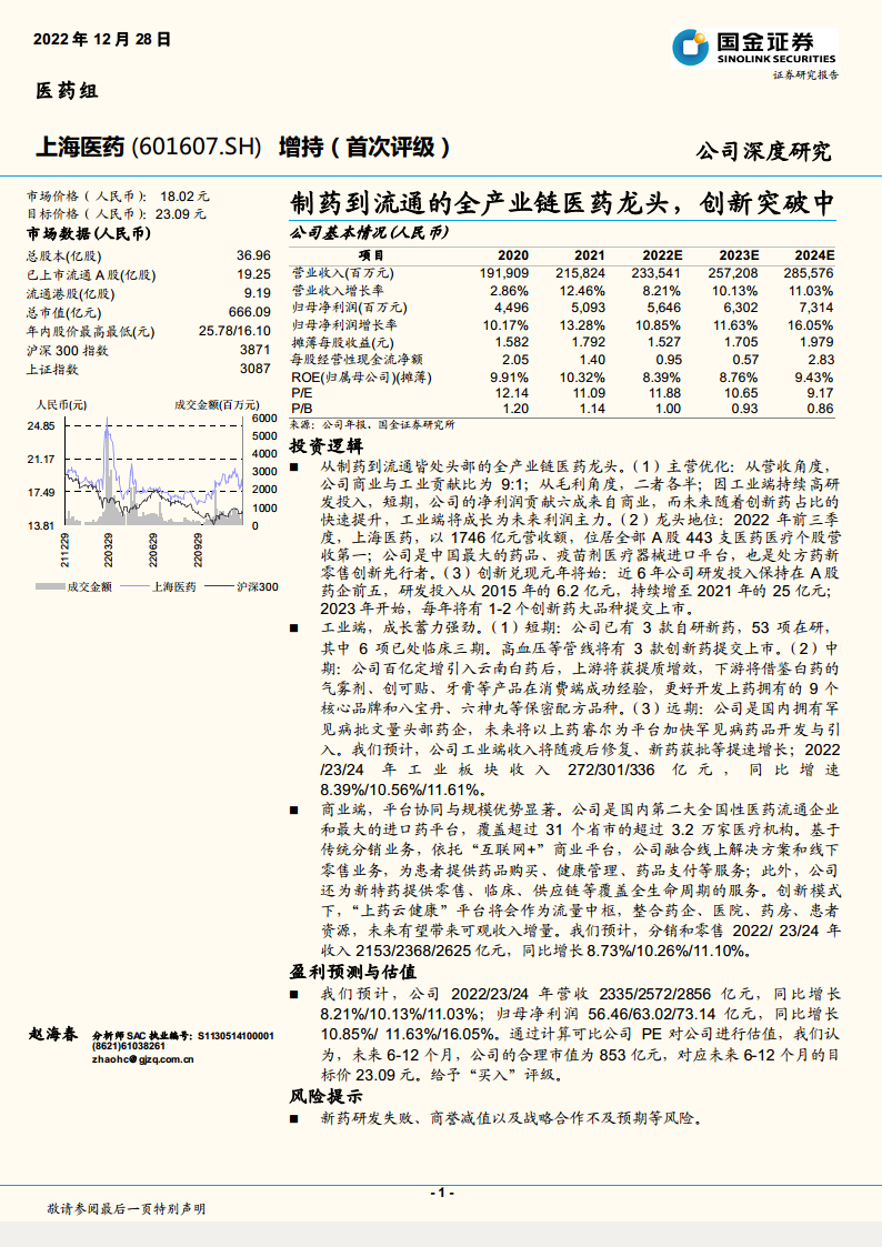 上海医药(601607):制药到流通的全产业链医药龙头,创新突破中