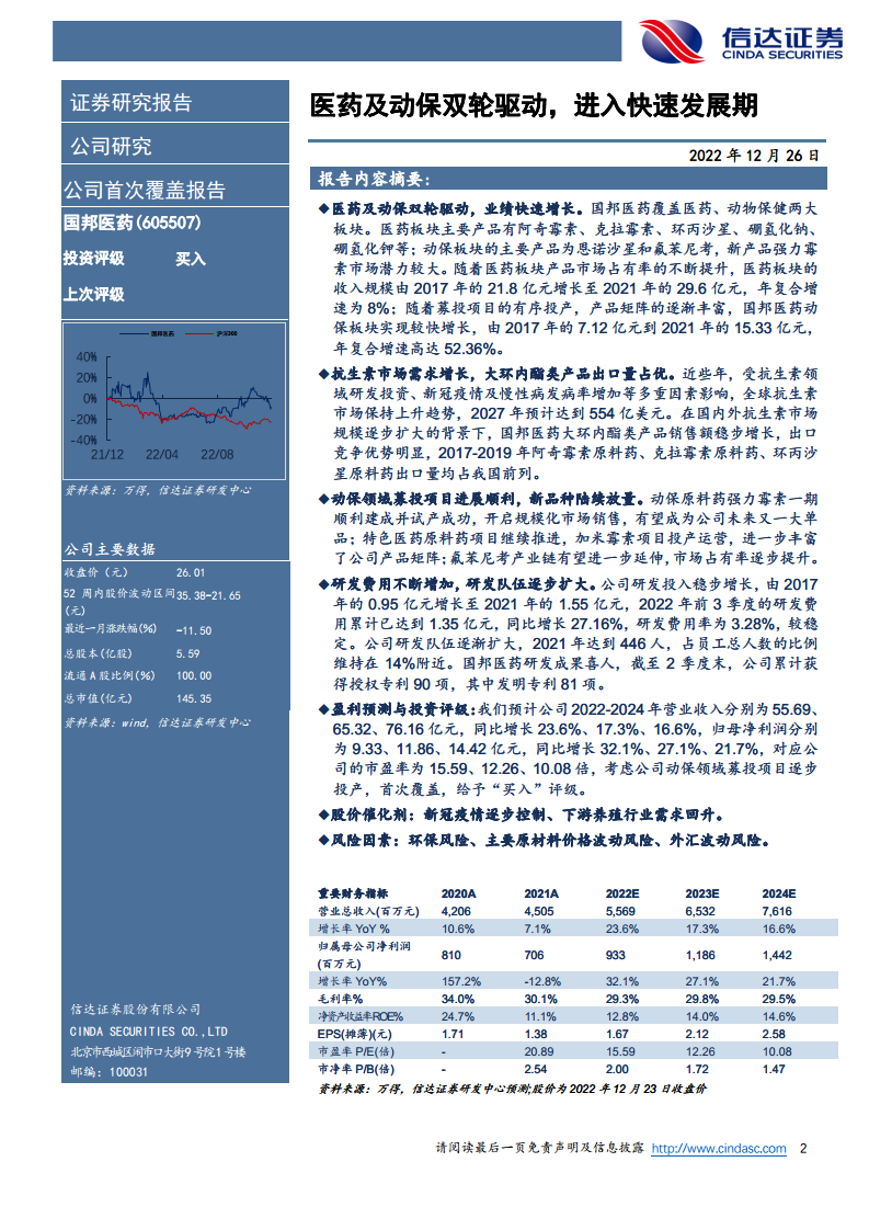 - 市盈率分析:根据盈利预测,公司2022-2024年对应的市盈率分别为15.59倍、12.26倍和10.08倍。与可比公司(如普洛药业、奥翔药业、仙琚制药、奥锐特)的平均市盈率(2022E平均33.05倍,2023E平均26.14倍,2024E平均20.41倍)相比,国邦医药的估值具有吸引力。