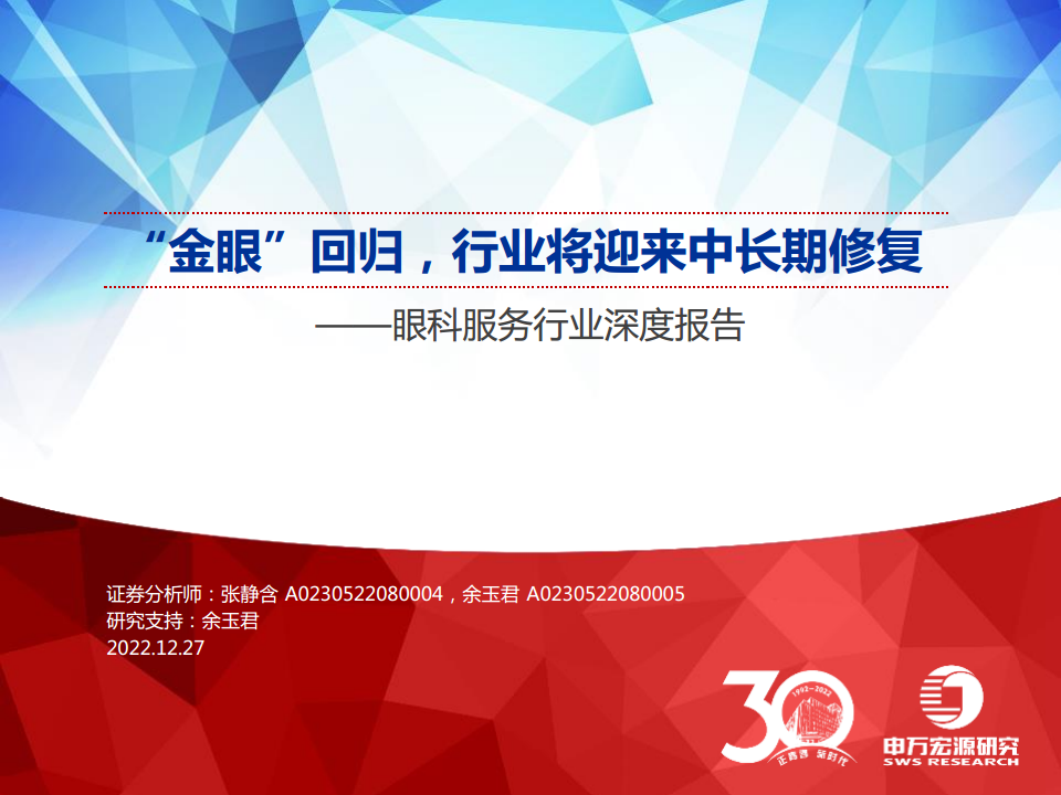 本报告深入分析了中国眼科服务行业在疫情影响下的表现及未来的发展潜力。尽管疫情短期内对眼科医院的门诊量和手术量造成显著冲击,导致2020年第一季度连锁眼科公司收入下滑25%-40%,但根据海外经验,防疫政策优化后,眼科门诊量恢复迅速,其同比增速甚至比刚需科室平均高出12%。这表明眼科服务行业具有较强的疫后弹性。同时,国家对社会办医的持续支持以及“扩大内需战略规划”的实施,将进一步助力眼科服务行业的复苏与长期增长。