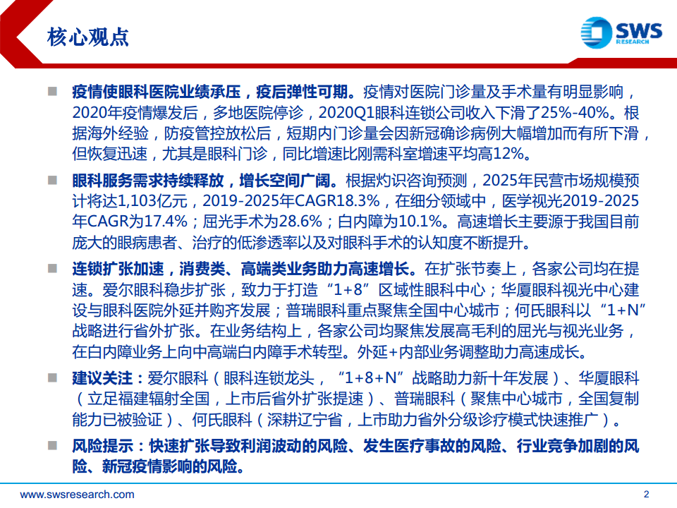 - 消费级眼科医疗服务市场提升空间大,是民营医院布局重点: 报告通过表格总结了白内障、屈光手术、医学视光、斜弱视、眼表疾病、眼底疾病等细分领域的患者人数、民营/公立市场规模、CAGR、民营医院单价和毛利率,强调消费级眼科服务的巨大潜力。