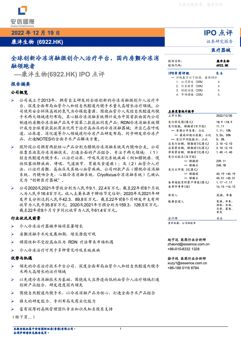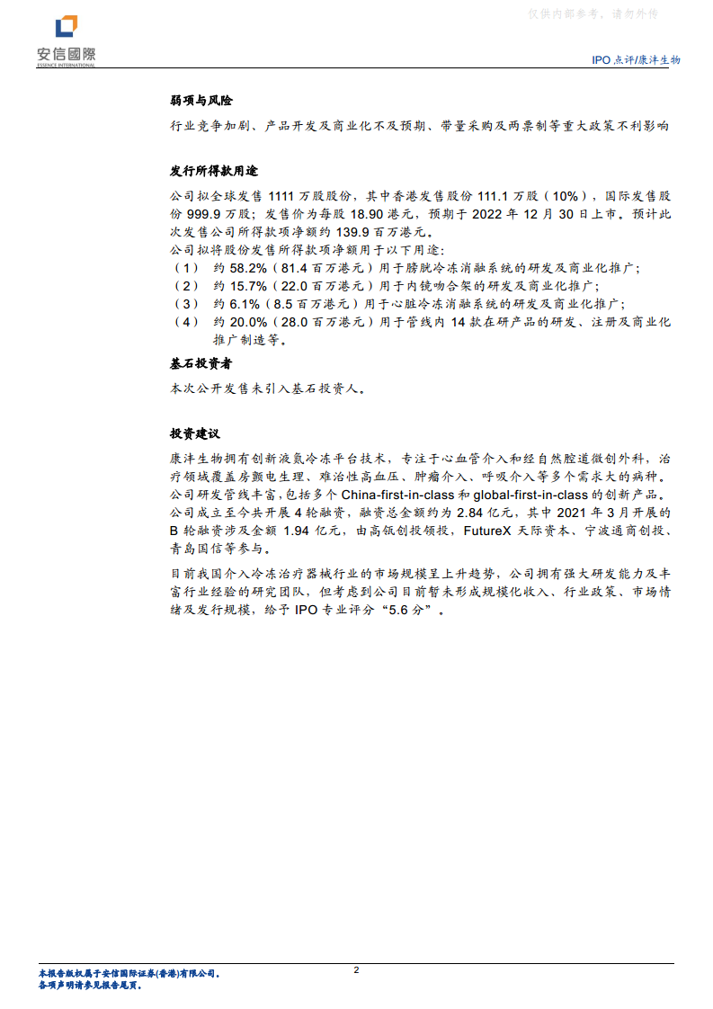 尽管我国介入冷冻治疗器械行业的市场规模呈上升趋势,且公司拥有强大研发能力及丰富行业经验的研究团队,但考虑到公司目前暂未形成规模化收入、行业政策的不确定性、市场情绪以及发行规模等因素,安信国际证券给予康沣生物IPO专业评分“5.6分”,反映了对其潜力和风险的综合考量。