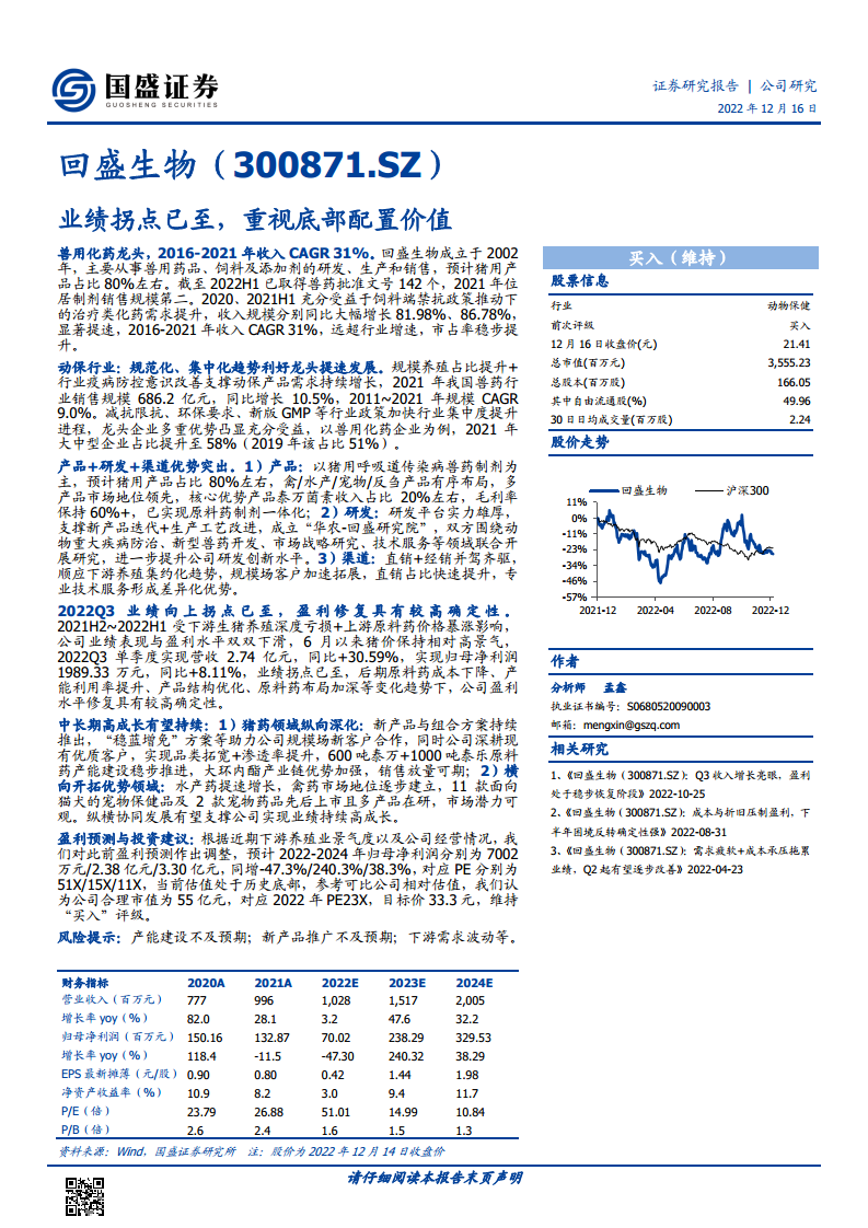 回盛生物作为兽用化药领域的领先企业,在经历短期业绩承压后,已于2022年第三季度迎来业绩向上拐点。公司凭借其在产品、研发和渠道方面的核心优势,有望在行业规范化、集中化趋势以及下游养殖业景气度回升的背景下,实现盈利能力的确定性修复和中长期可持续高成长。当前估值处于历史底部,具备显著的配置价值。