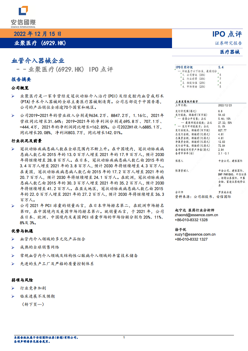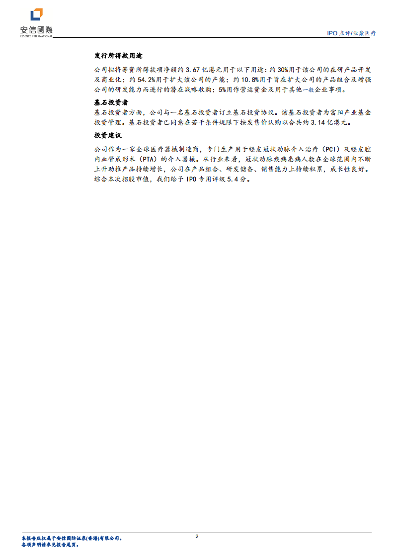 综合来看,业聚医疗作为全球血管介入器械制造商,受益于全球冠状动脉疾病患病人数的持续增长。公司在产品组合、研发储备和销售能力方面的积累,为其提供了良好的成长基础。本次IPO的筹资策略也清晰地支持了公司的长期发展目标。基于此,报告给予IPO专用评级5.4分。