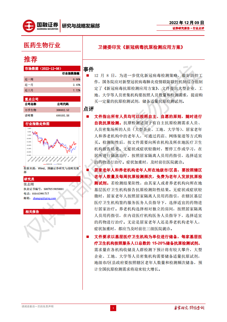 卫健委新发布的《新冠病毒抗原检测应用方案》明确了抗原检测在多场景的应用,包括大型机构储备、个人自愿检测以及为老年人免费发放等,预计将显著提升全国抗原检测试剂的市场需求量。