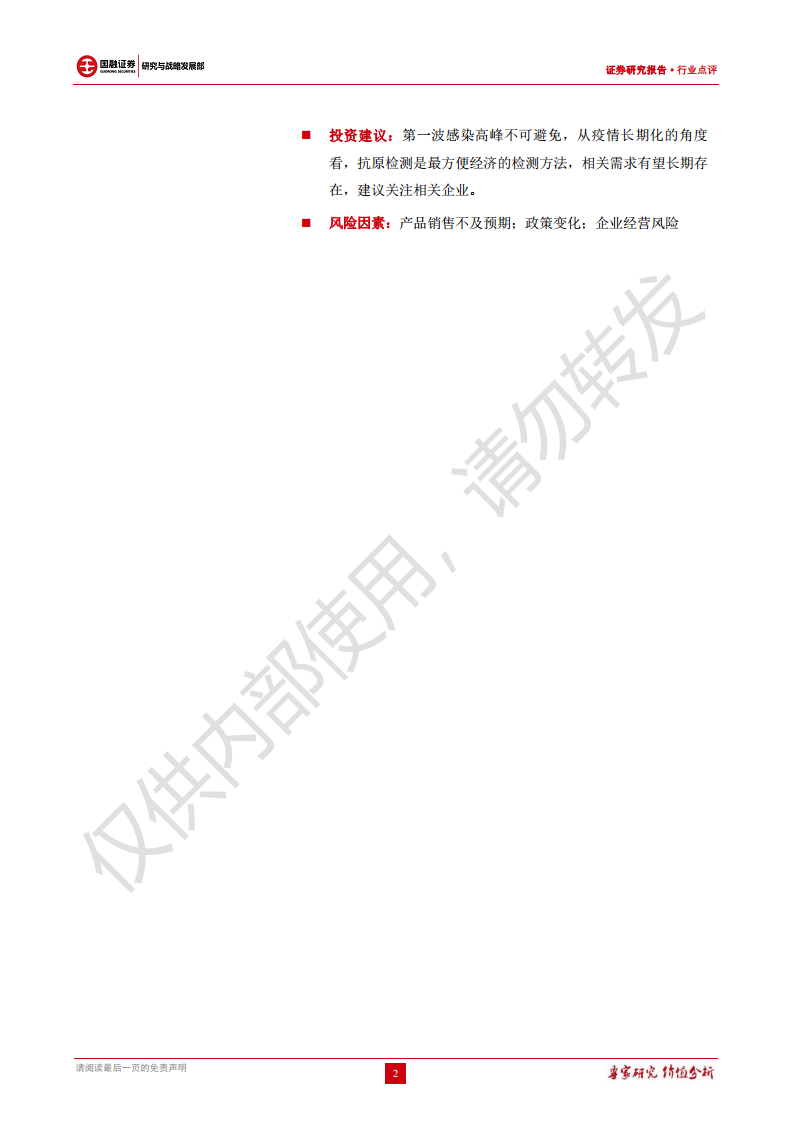 面对不可避免的感染高峰和疫情长期化趋势,抗原检测作为一种方便经济的检测方法,其相关需求有望长期存在,为医药生物行业中从事抗原检测业务的企业带来持续的增长机遇。