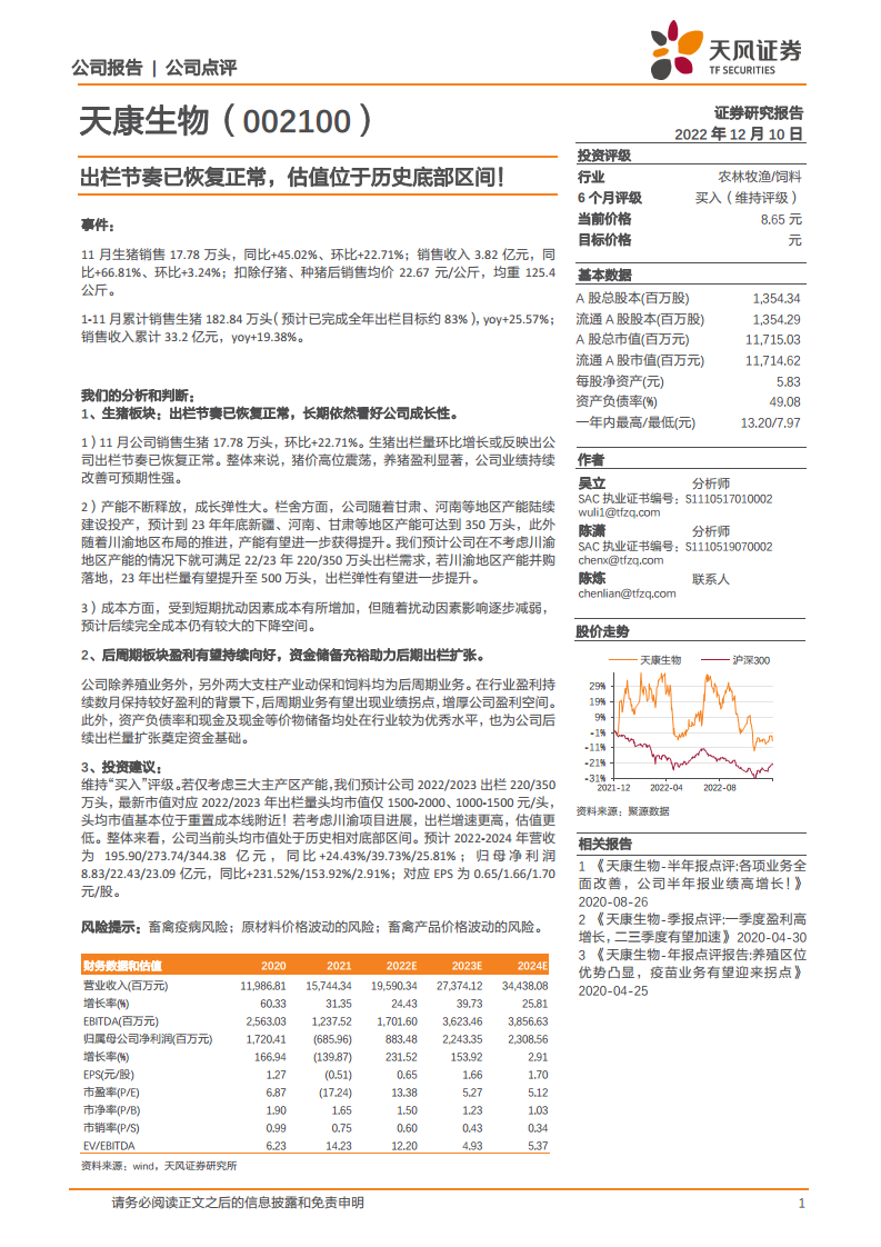 根据报告,天康生物2022年11月生猪销售表现强劲: