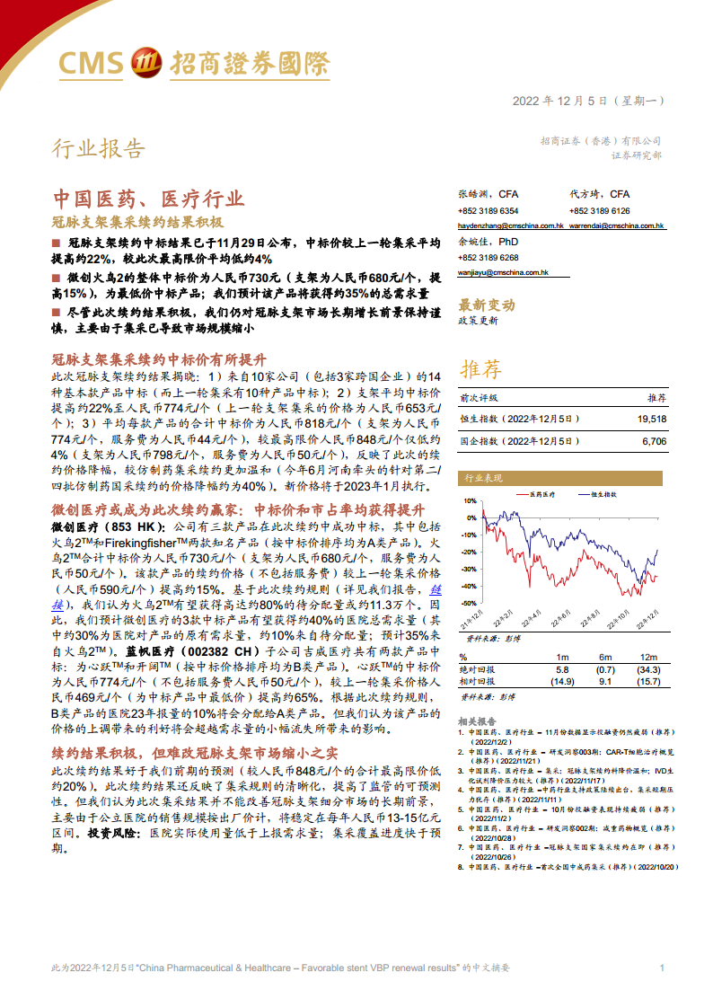 中国医药、医疗行业:冠脉支架集采续约结果积极