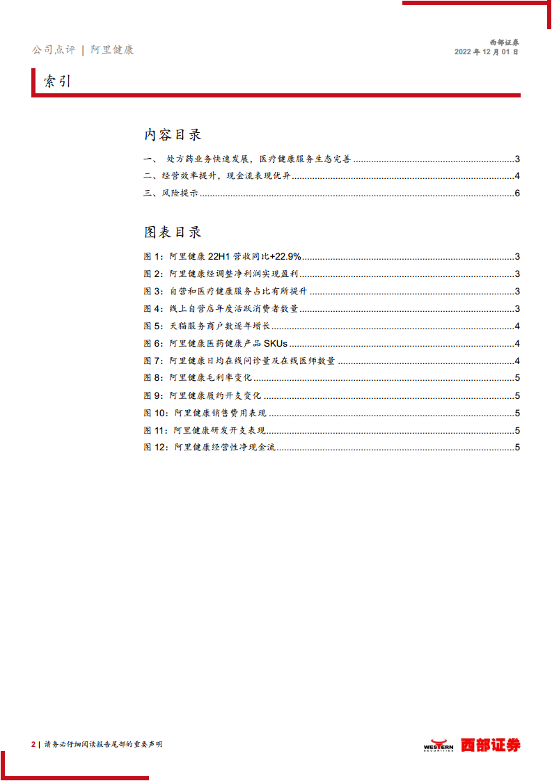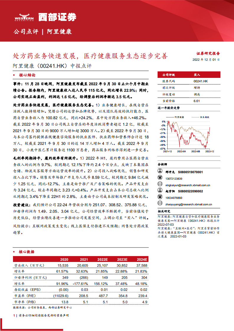 阿里健康在2022年上半年展现出强劲的增长势头和显著的经营改善。公司核心的处方药业务实现高速增长,带动整体收入和利润实现突破性进展,首次实现正面盈利。通过优化运营效率,降低履约费用、销售及市场推广开支和产品开发支出占比,公司在成本控制和盈利能力方面取得了显著成效。同时,阿里健康持续完善其医疗健康服务生态,扩大了专业服务团队和患者覆盖范围。鉴于公司经营效率的不断提升、当前估值处于历史低位以及经营业绩的持续改善,分析师上调公司评级至“买入”。然而,投资者仍需关注互联网政策变化、线上医保支付推进不及预期以及网售处方药政策趋紧等潜在风险。