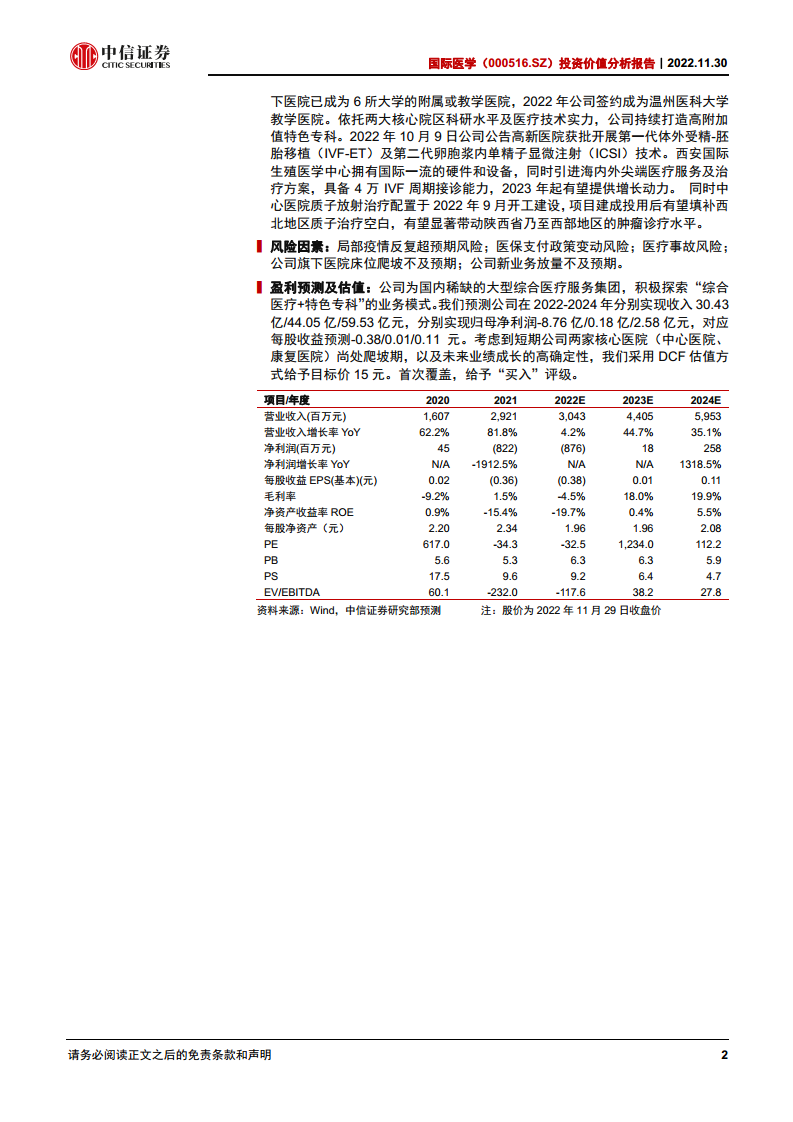 报告提示了多项风险,包括局部疫情反复超预期、医保支付政策变动、医疗事故、公司旗下医院床位爬坡不及预期以及新业务放量不及预期等。