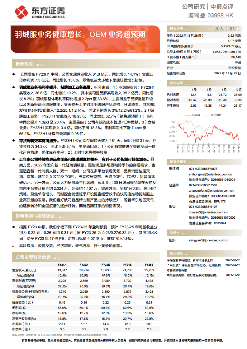波司登在FY23H1财报中展现出强劲的业绩韧性,营业收入和归母净利润均实现双位数增长,远超市场预期。这主要得益于核心羽绒服业务的健康发展、品牌重塑升级带来的毛利率提升,以及贴牌加工业务的超预期增长。公司在品类创新、渠道优化和高效库存管理方面取得了显著成效,存货周转效率显著提升,并通过成功的市场营销策略有效拓展了新生代客群。尽管女装业务面临挑战,但整体业务结构优化和运营效率提升为公司长期可持续发展奠定了坚实基础。分析师基于稳健的业绩表现,维持“买入”评级,并设定目标价4.07港币,但同时提示了疫情、经济、天气及行业竞争等潜在风险。随着华东地区天气转冷和全国疫情形势逐步好转,公司有望在即将到来的销售旺季取得更优异的表现。