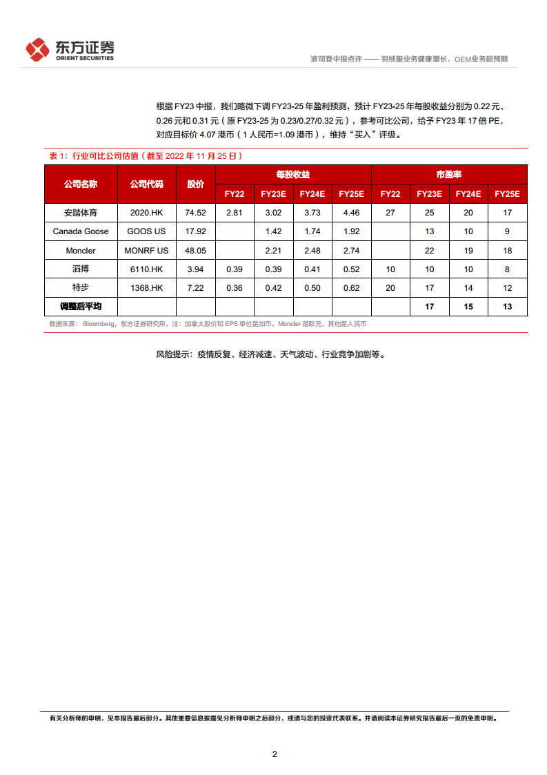 基于FY23H1的中报表现,分析师对公司FY23-25年的盈利预测进行了小幅下调,预计每股收益分别为0.22元、0.26元和0.31元(原预测为0.23/0.27/0.32元)。参考行业可比公司的估值水平,分析师给予波司登FY23年17倍市盈率(PE),对应目标价为4.07港币(按1人民币=1.09港币汇率计算)。鉴于公司稳健的业绩增长和市场策略的有效性,分析师维持“买入”评级。