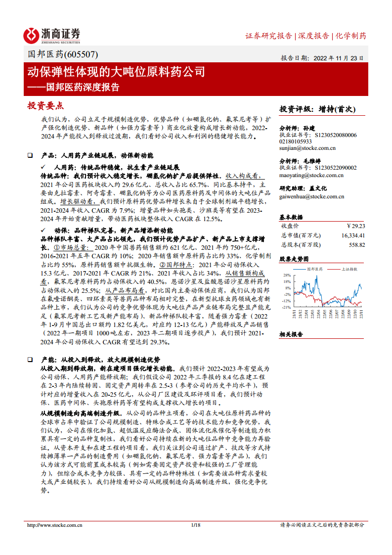 国邦医药作为一家大吨位原料药公司,正通过强化其规模制造优势、优化产品结构和释放新增产能,实现稳健增长。公司在人用药板块通过传统优势品种的稳定增长和抗生素产业链的延展来巩固市场地位,同时在动保板块通过完善品种梯队、扩充大产品产能(如氟苯尼考、强力霉素)和推出新型兽药来抓住市场机遇。预计2022-2024年,随着山东、浙江等厂区新产能的逐步释放和利用率的提升,以及动保产品量价的修复,公司将形成医药与动保双轮驱动的经营结构,收入和利润有望持续增长。尽管面临原材料价格波动、贸易摩擦等风险,但其估值低于可比公司平均水平,具备投资吸引力,首次覆盖给予“增持”评级。