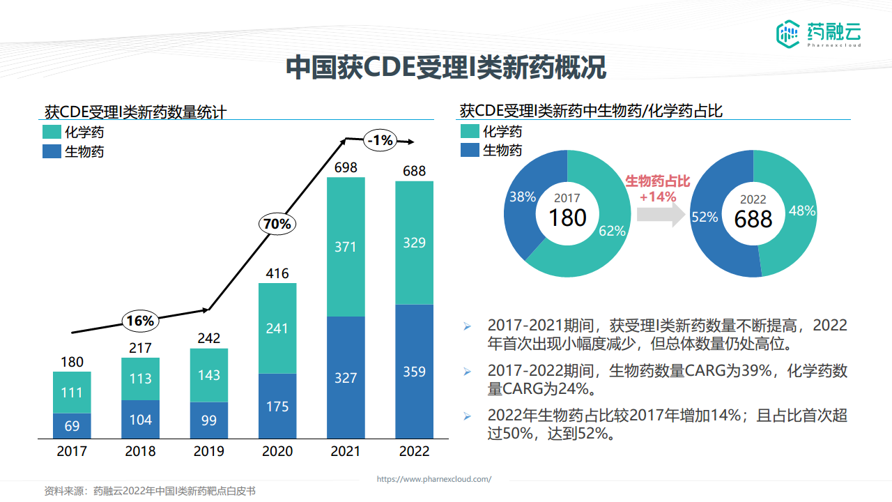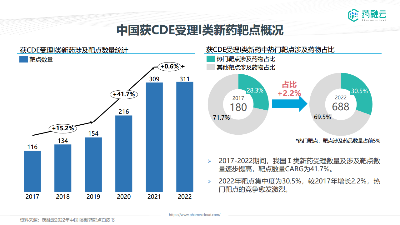 本节首先分析了中国获CDE受理I类新药的概况,数据显示,中国新药研发呈现快速发展态势,生物药占比逐年提升。 随后,报告明确定义了“中国新靶点”的概念:即在全球已有IND及以上研发阶段的靶点,但在中国国内企业研发较少或未取得研究进展的靶点。 报告还详细阐述了如何利用药融云数据库深入挖掘“中国新靶点”,包括确定适应症(具备未满足的临床需求、研发热度高、市场前景广阔)以及利用数据库筛选潜在靶点两个关键步骤。