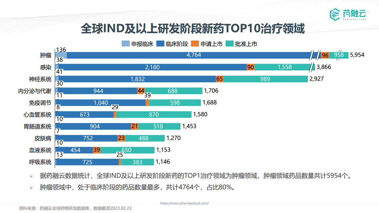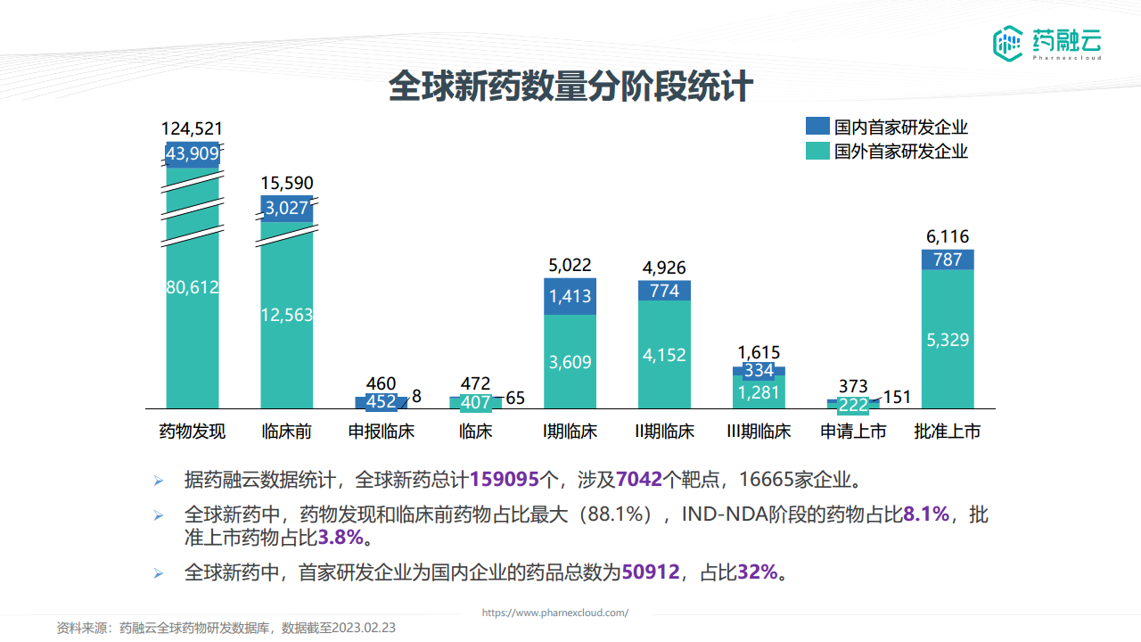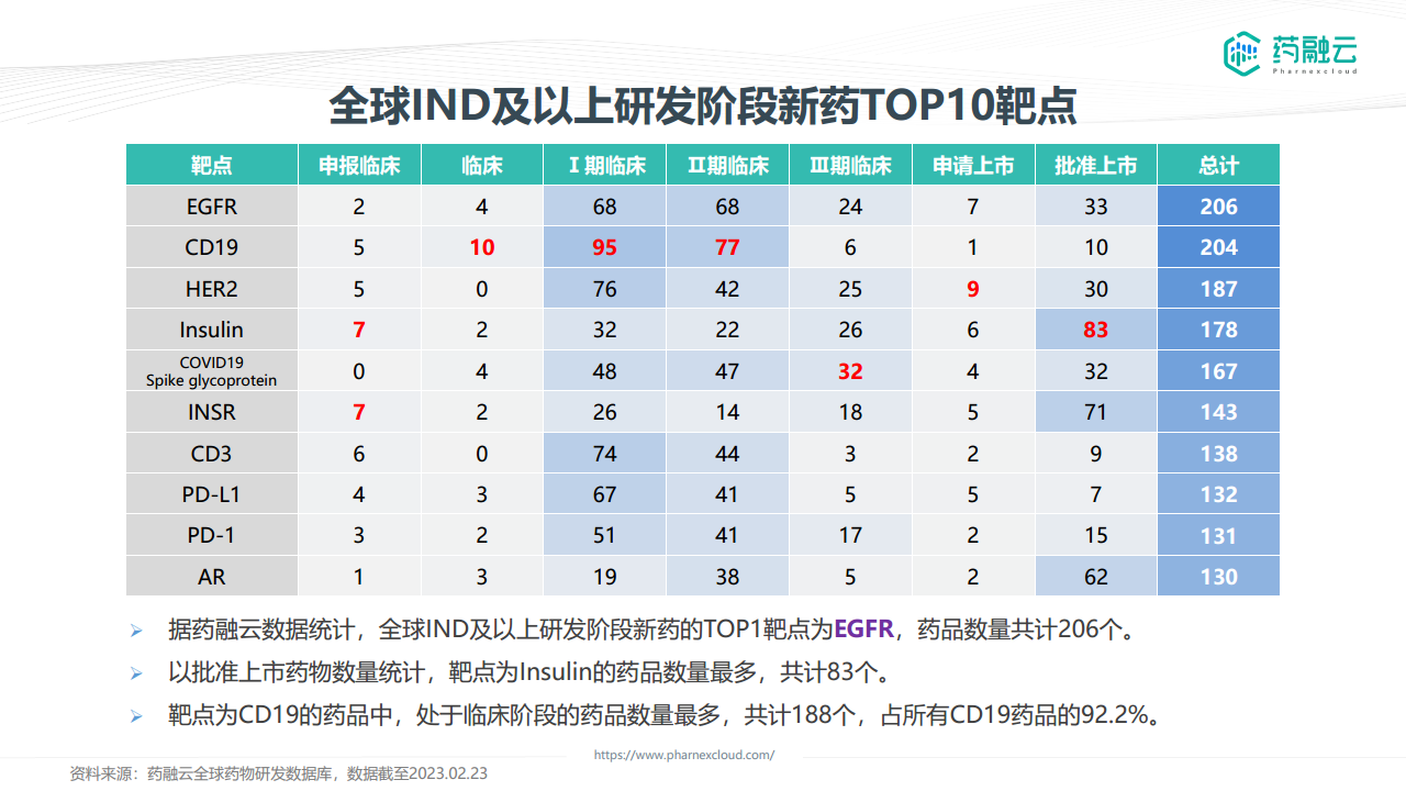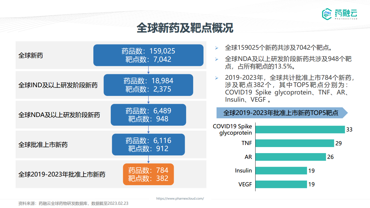 本节通过药融云数据库的数据,从全球新药数量、研发阶段分布、治疗领域分布以及靶点分布等多个维度,对全球新药研发现状进行了全面的概述。数据显示,全球新药研发主要集中在药物发现和临床前阶段,已批准上市的药物占比相对较小;肿瘤领域是研发最热门的治疗领域;EGFR和Insulin是研发最热门的靶点。 这些数据为理解全球新药研发趋势,以及后续“中国新靶点”分析提供了重要的背景信息。