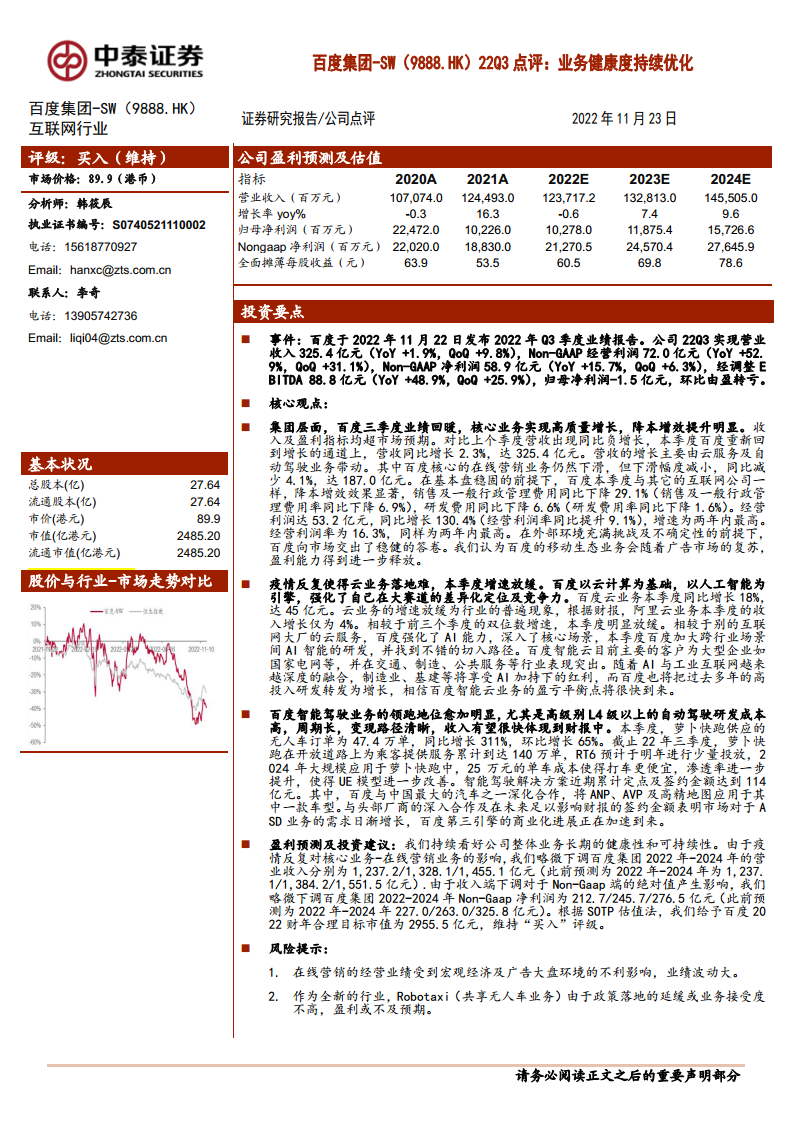 百度集团-SW(09888)22Q3点评:业务健康度持续优化