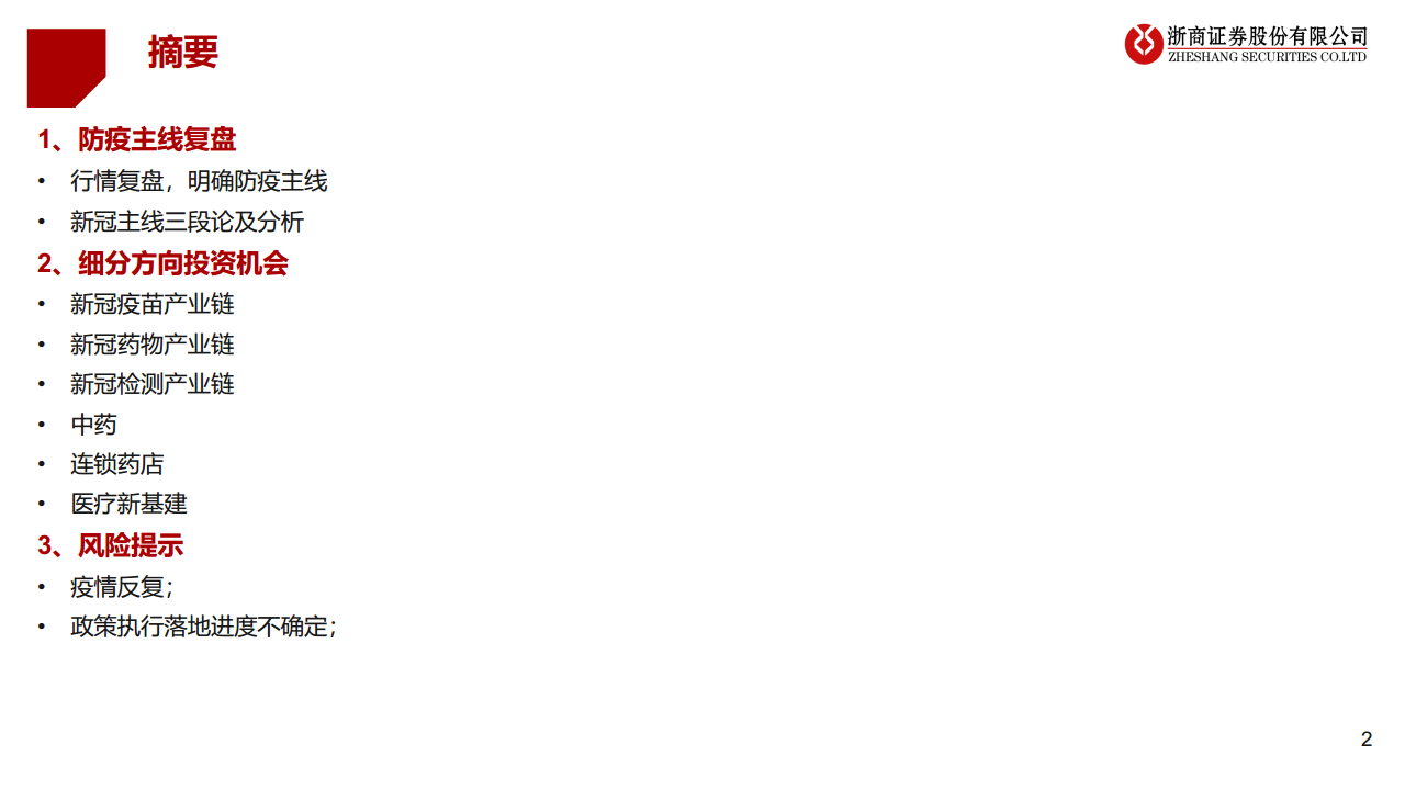 报告强调,短期内防疫产业链仍有新进展和增量逻辑,而中期则聚焦政策驱动下的医疗新基建和连锁药店的渠道价值。长期来看,常规诊疗和消费医疗的复苏将带来业绩增长和估值修复,特别是中药创新药和国产医疗设备、器械耗材的崛起。