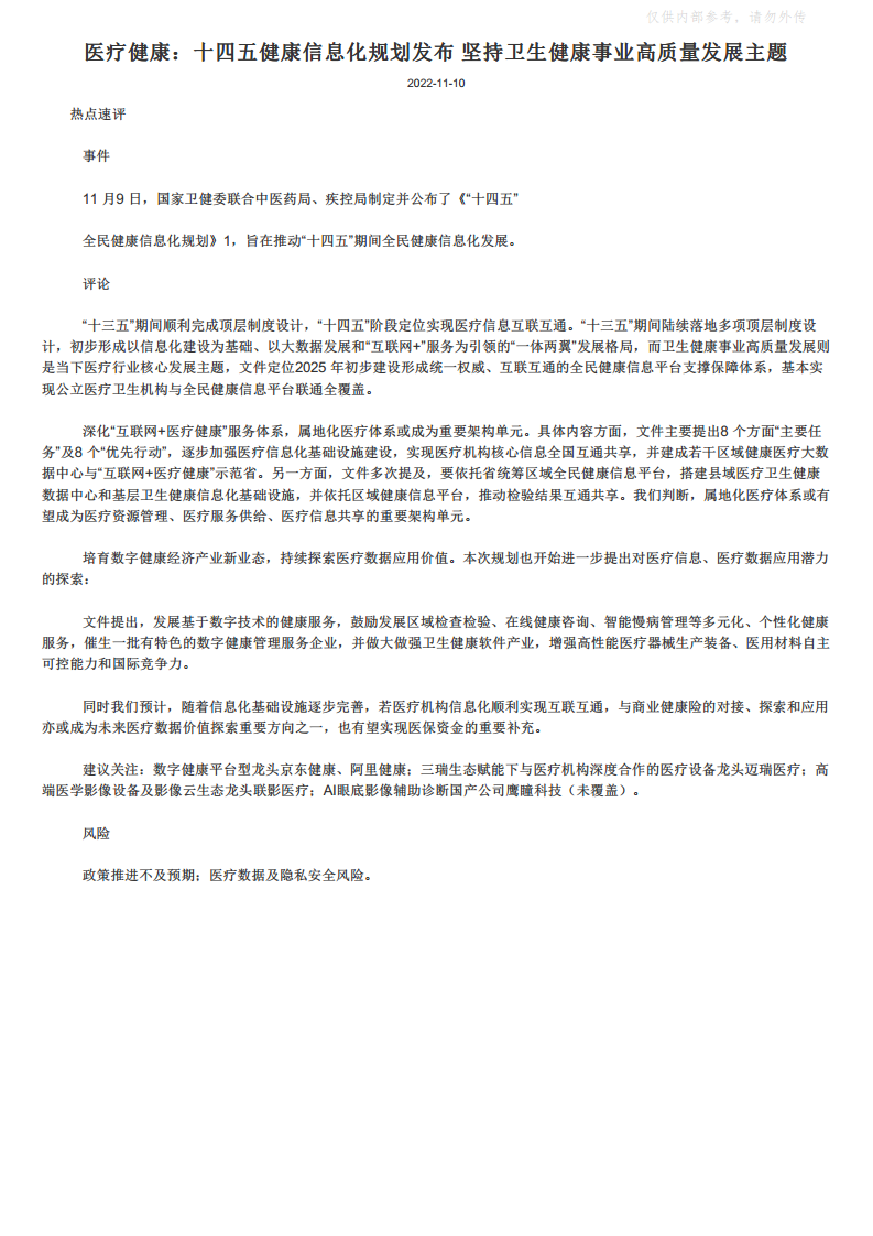 医疗健康行业:十四五健康信息化规划发布,坚持卫生健康事业高质量发展主题