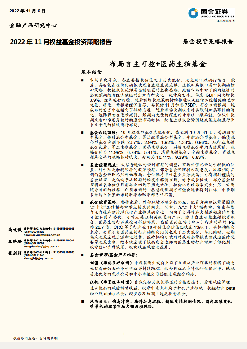 本报告深入分析了2022年11月权益基金的投资策略,指出当前A股市场估值处于历史低位,随着国内经济数据回暖和稳增长政策的推进,以及美联储加息边际影响的减弱,四季度是逢低布局的良好时机。投资策略建议紧密围绕“二十大”报告精神,重点关注科技自立自强背景下的自主可控主题,尤其在大科技和大制造领域,相关板块如电子、通信、军工、计算机等因估值优势具备较高配置性价比。同时,医药生物行业在经历长期调整后,估值和机构持仓均处于历史低位,且近期政策面出现积极信号,其收益风险比显著提升,亦是值得低位布局的重要方向。报告回顾了10月基金市场表现,军工、医药、科技主题基金表现居前,并跟踪了基金经理的调研观点,显示部分左侧风格基金经理已开始积极布局。最后,报告推荐了刘潇(华安医疗创新)和张帆(华夏经济转型)两位基金经理及其管理产品,并给出了一个兼顾长期管理能力、业绩持续性与市场边际变化的权益基金组合,该组合在行业分布上相对均衡,重点配置于周期、消费、制造领域。