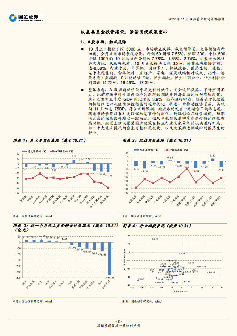 - 中长期来看,四季度是较好的逢低布局时机,配置上建议紧密围绕政策支持且行业未来景气的板块,如“二十大”重点提及的自主可控相关板块,以及政策面边际放松的医药生物行业。