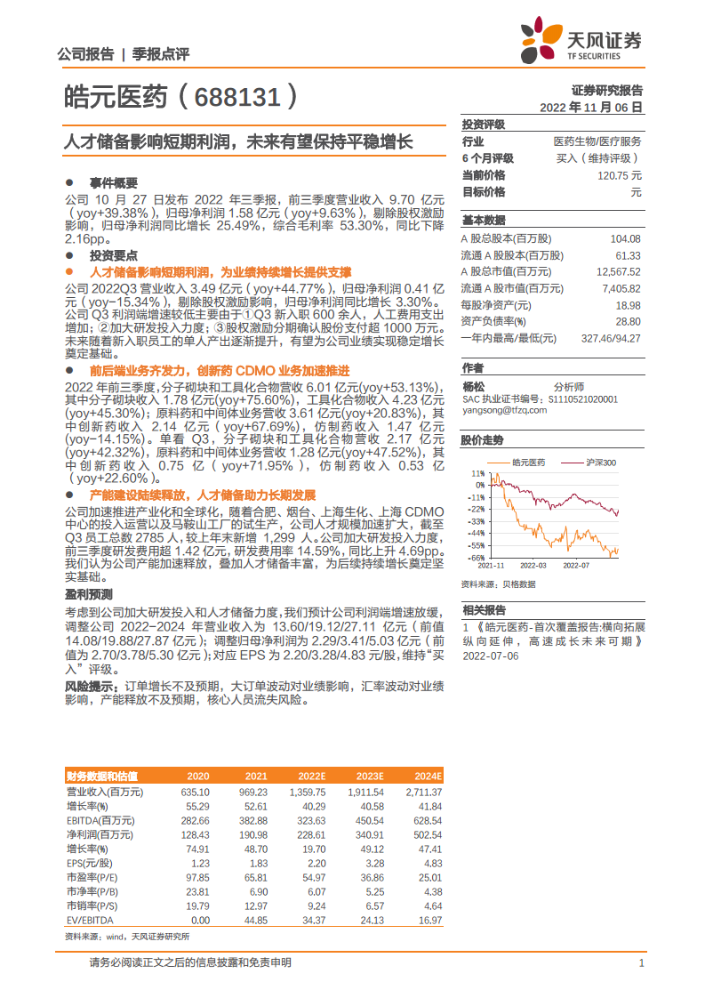 皓元医药在2022年前三季度实现了营收的快速增长,但由于公司在人才储备和研发投入上的战略性投入,短期内归母净利润增速有所放缓。这些投入是公司为未来长期发展所做的必要铺垫,旨在提升核心竞争力。公司前端和后端业务协同发展,特别是创新药CDMO业务表现强劲,成为业绩增长的重要驱动力。随着新产能的逐步释放和人才队伍的持续壮大,公司有望在医药研发服务市场保持稳健增长态势。尽管短期利润承压,但长期来看,公司具备持续增长的潜力,维持“买入”评级。