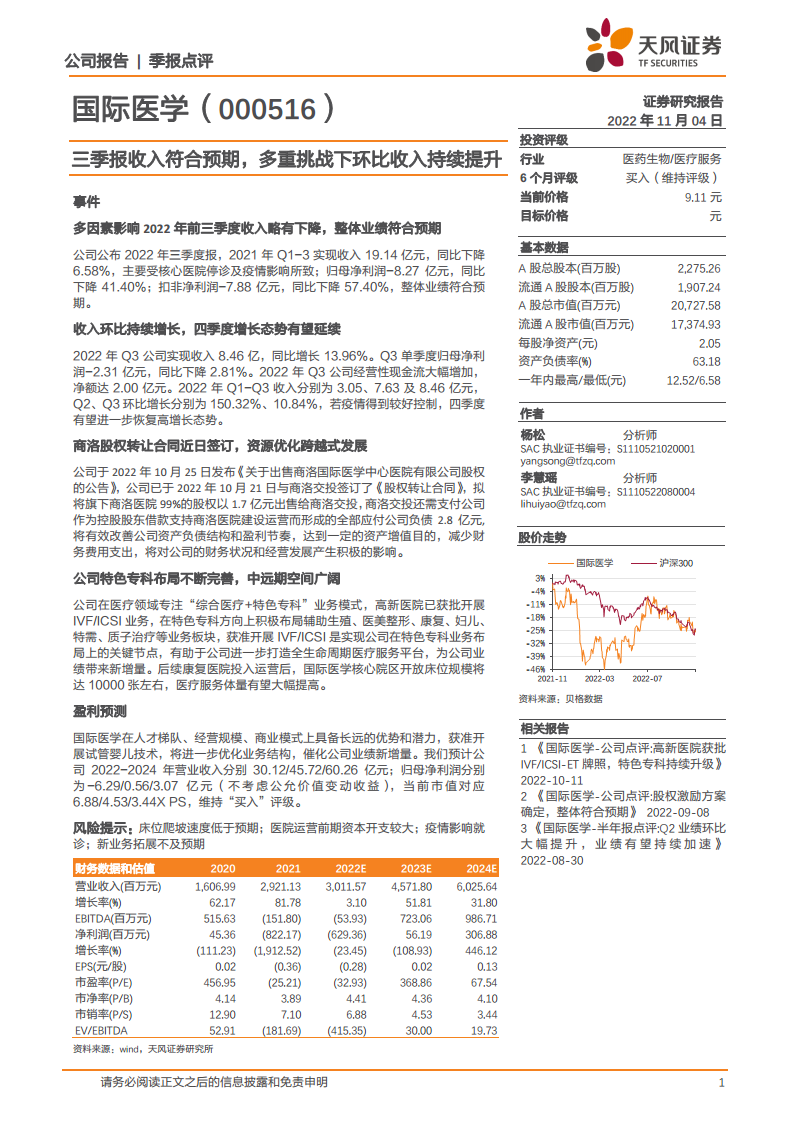 国际医学(000516):三季报收入符合预期,多重挑战下环比收入持续提升