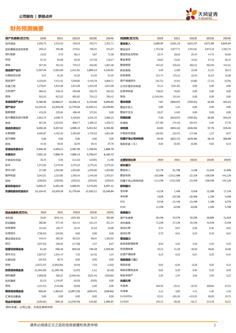 基于公司在人才梯队、经营规模和商业模式上的长远优势及潜力,特别是试管婴儿技术的获批将优化业务结构并催化业绩增长,分析师预计公司2022-2024年营业收入将分别达到30.12亿元、45.72亿元和60.26亿元。归母净利润预计分别为-6.29亿元、0.56亿元和3.07亿元(不考虑公允价值变动收益)。当前市值对应2022-2024年PS分别为6.88X、4.53X和3.44X。报告维持“买入”评级。 风险提示包括:床位爬坡速度低于预期、医院运营前期资本开支较大、疫情影响就诊以及新业务拓展不及预期。
