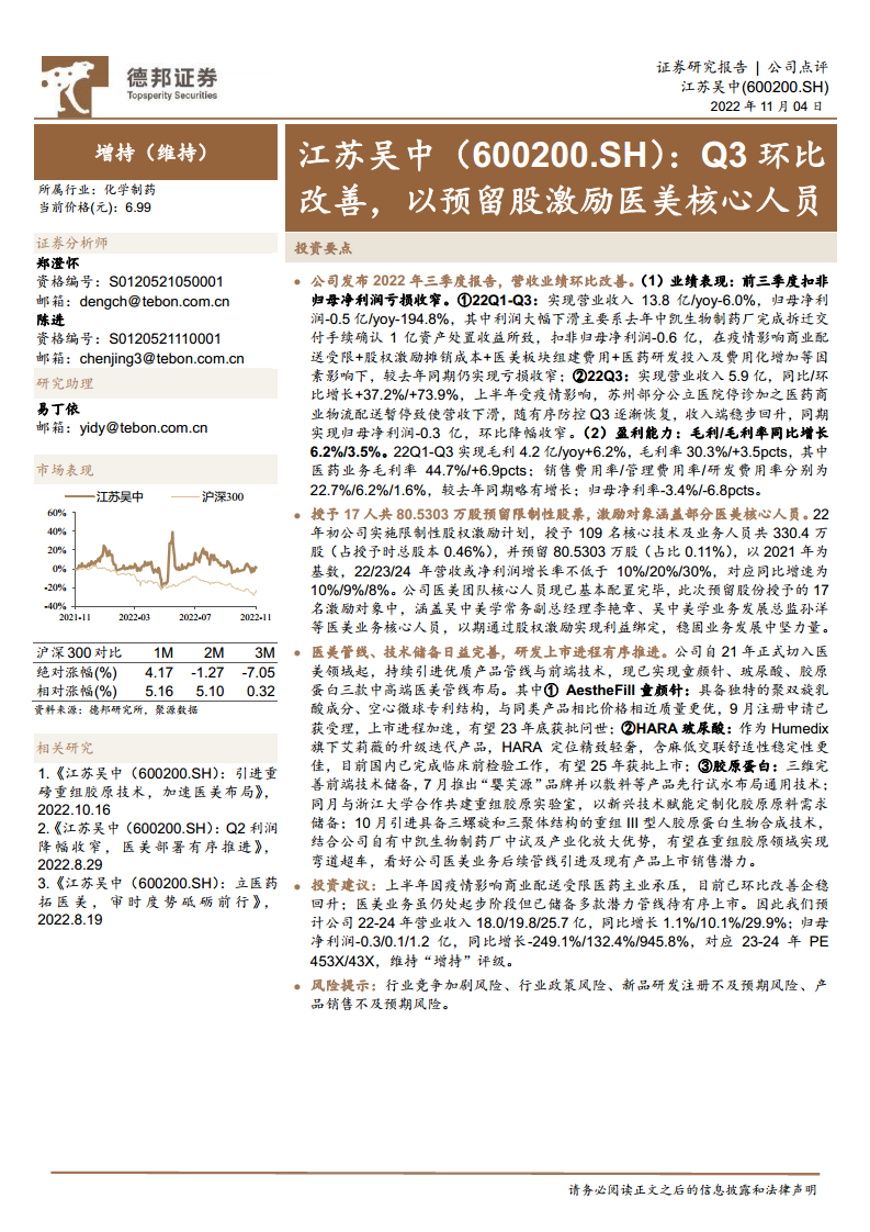 江苏吴中在2022年第三季度实现了财务业绩的显著改善,营收环比大幅增长,亏损幅度收窄,显示出公司在克服外部不利因素后的强劲复苏势头。公司正坚定不移地推进医美业务的战略转型,通过实施股权激励计划以稳定和吸引核心人才,并积极布局童颜针、玻尿酸和重组胶原蛋白等中高端医美产品管线。多款医美产品已进入关键研发或注册阶段,有望在未来几年内陆续上市,为公司带来新的增长动力。尽管面临行业竞争加剧和政策变化等风险,但医美业务的逐步成熟和放量有望驱动公司业绩实现高速增长,因此维持“增持”评级。