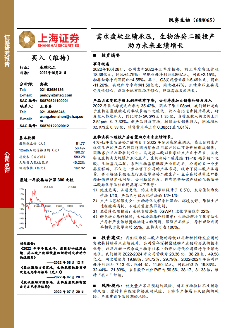 凯赛生物在2022年第三季度面临宏观经济和疫情带来的短期业绩压力,营收和净利润出现下滑。然而,公司积极应对,持续加大研发和销售投入,并成功实现了生物法癸二酸的大规模产业化生产。生物法癸二酸凭借其在产品质量、环保效益、碳排放降低以及原料供应保障方面的显著优势,成为公司未来业绩增长的核心驱动力。分析师对公司未来发展持乐观态度,预测其营收和净利润将持续增长,并维持“买入”评级。尽管存在量产、市场验证、原材料价格波动等风险,但凯赛生物在合成生物学领域的技术积累和创新突破,有望使其在行业中保持领先地位,实现长期可持续发展。