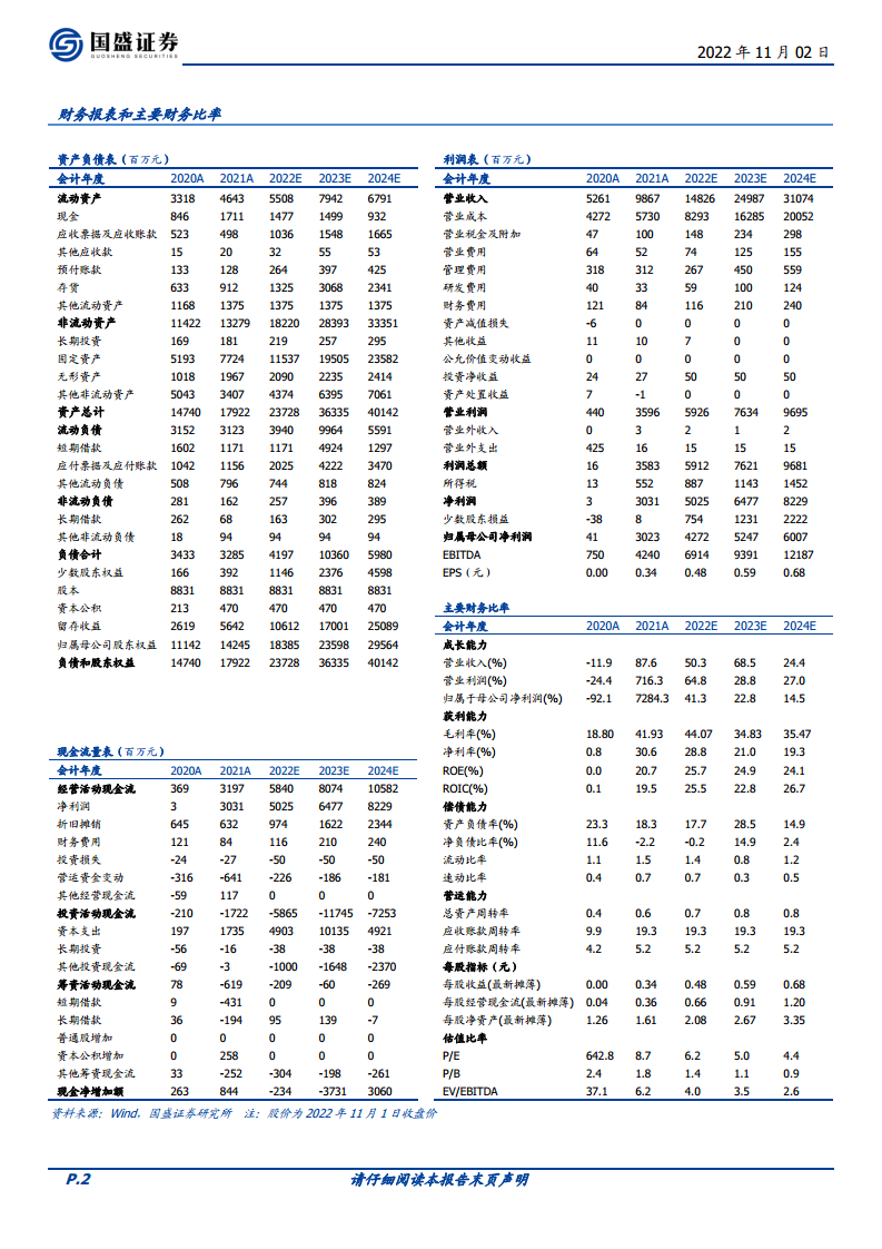 基于公司传统主业的高景气度和光伏材料业务的集中投产,国盛证券研究所对和邦生物未来的财务表现进行了预测。预计公司2022年至2024年的营业收入将分别达到148.26亿元、249.87亿元和310.74亿元,呈现出显著的增长态势。同期,归属于母公司股东的净利润预计分别为42.72亿元、52.47亿元和60.07亿元。按照2022年11月1日的收盘价计算,公司对应的市盈率(PE)分别为6.2倍、5.0倍和4.4倍,显示出较低的估值水平。分析指出,到2024年,光伏板块业务有望为公司贡献约50%的归母净利润,这将显著提升公司的整体盈利结构和市场估值。
