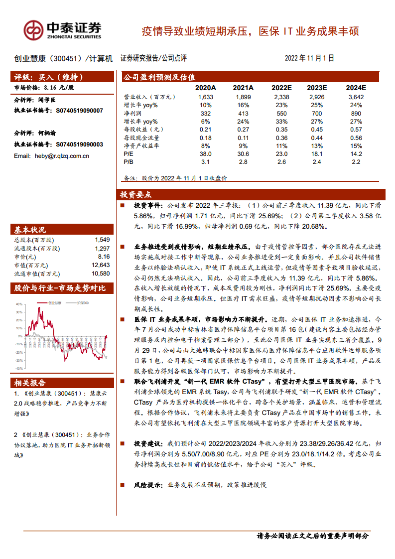 创业慧康在2022年前三季度受疫情影响,业绩短期承压,收入和净利润均出现下滑。然而,公司在医疗IT领域的长期需求依然旺盛,且在医保IT业务方面取得了显著进展,成功中标多个省级和国家级项目,市场影响力不断提升。此外,公司与飞利浦的战略合作,联合开发“新一代EMR软件CTasy”,有望借助飞利浦的渠道优势,成功拓展大型三甲医院市场,为未来增长注入新动力。综合考虑公司业务的持续高成长性和当前估值水平,分析师维持“买入”评级,并预计未来几年公司业绩将实现稳健增长。投资者需关注业务发展不及预期和政策推进缓慢的风险。