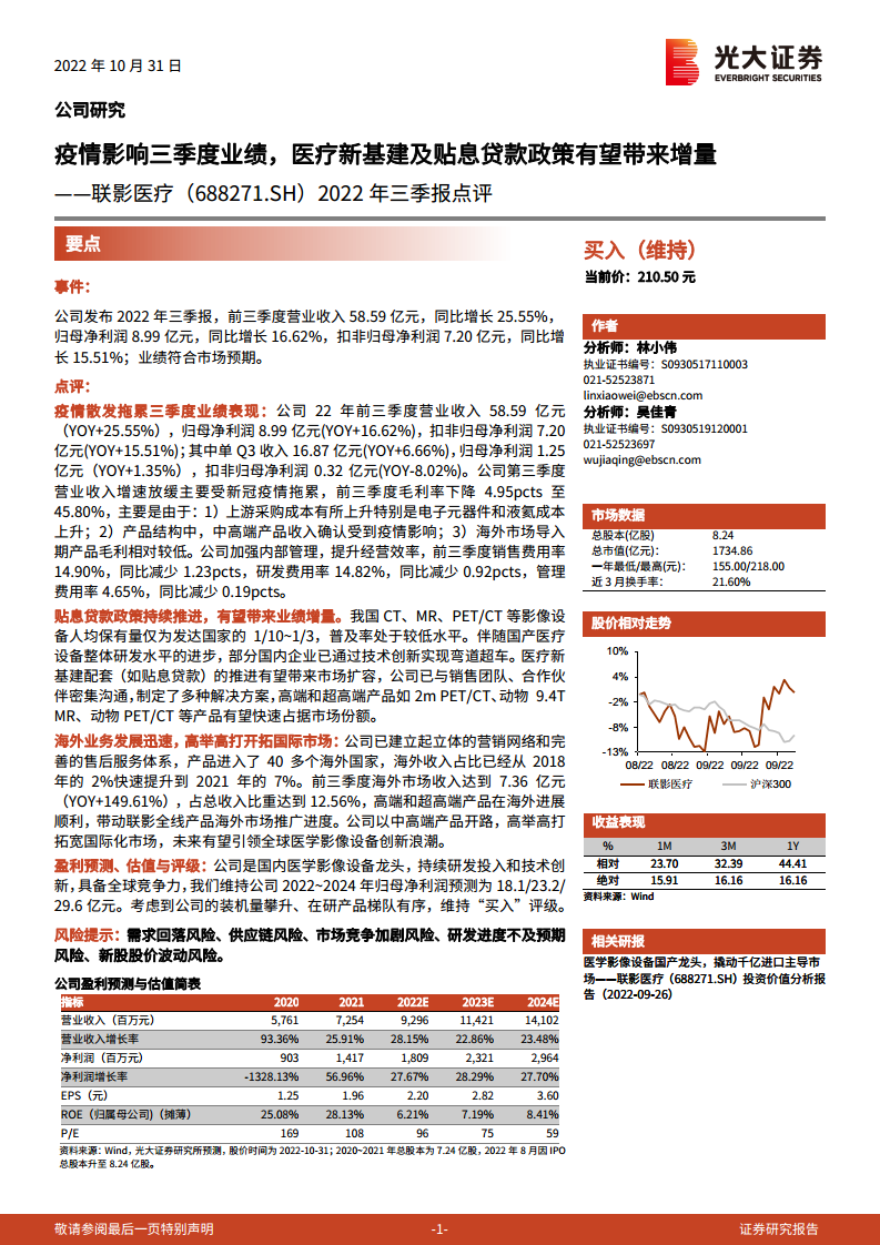 联影医疗2022年前三季度业绩在疫情影响下展现出韧性,尽管第三季度增速放缓,但公司通过精细化管理有效控制了成本。展望未来,中国医疗新基建及贴息贷款政策将为公司带来巨大的市场增量,而其高速增长的海外业务和高端产品战略则进一步巩固了其国际市场地位。综合来看,联影医疗凭借其技术创新和市场拓展能力,有望在政策红利和全球化布局下实现持续增长,维持“买入”评级。