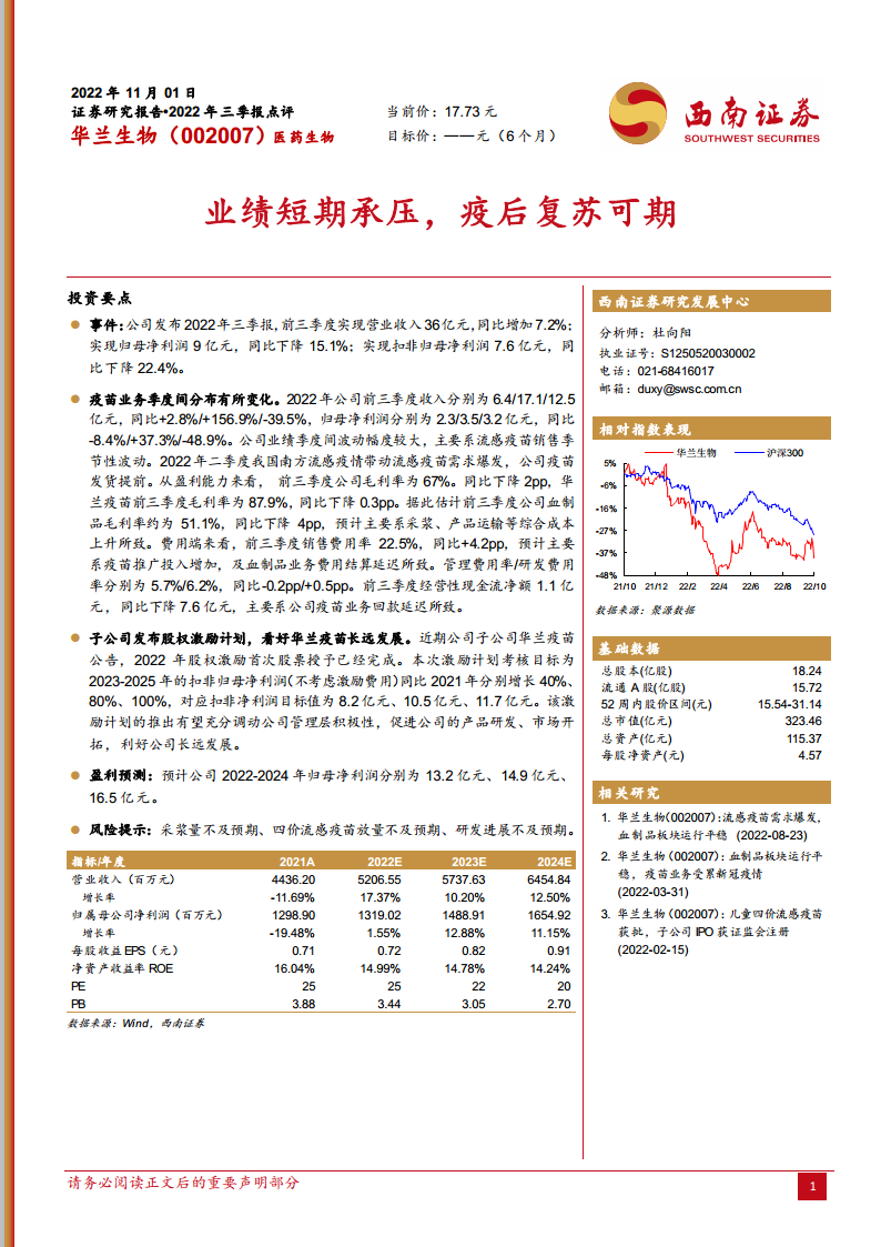 华兰生物2022年三季报显示,公司在营收同比增长7.2%的同时,归母净利润和扣非归母净利润分别同比下降15.1%和22.4%,业绩短期承压。这主要源于流感疫苗销售的季节性波动导致发货提前、血制品业务综合成本上升以及疫苗推广投入增加,进而影响了毛利率和经营性现金流。然而,公司子公司华兰疫苗推出的股权激励计划,设定了未来三年扣非归母净利润的明确增长目标(2023年增长40%,2024年增长80%,2025年增长100%),旨在激发管理层积极性,促进研发和市场开拓,为公司长期发展注入动力。分析师预测公司未来三年归母净利润将持续增长,表明市场对公司疫后复苏和疫苗业务增长抱有信心。尽管存在采浆量、四价流感疫苗放量及研发进展不及预期等风险,华兰生物凭借其核心业务的战略调整和激励机制,有望在未来实现业绩的稳健增长和长期发展。