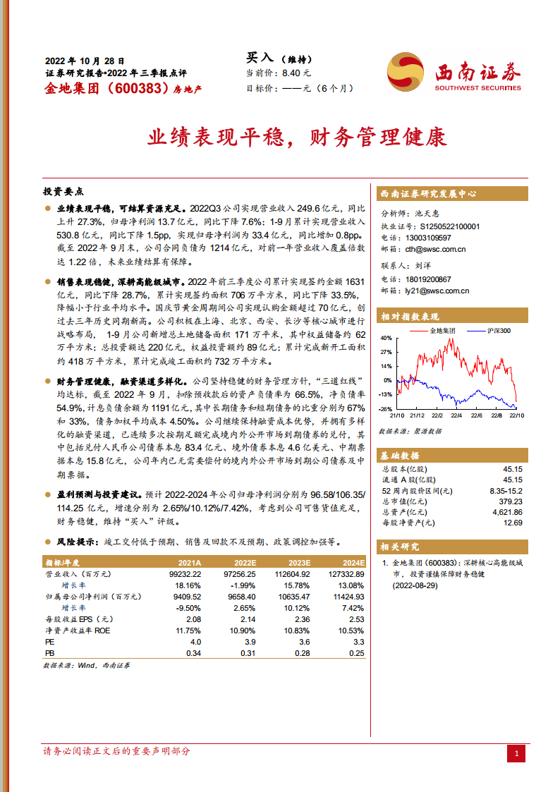- 根据财务预测,金地集团的营业收入在2022年预计小幅下降1.99%至972.56亿元后,将在2023年和2024年分别实现15.78%和13.08%的增长,达到1126.05亿元和1273.33亿元。