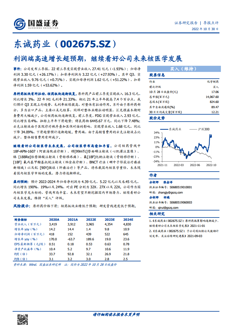 东诚药业在2022年第三季度实现了超预期的利润高速增长,主要得益于原料药板块的强劲拉动和核药板块的逐步恢复。公司在核医学领域拥有丰富的在研管线,这些创新产品有望在未来国内核医学市场中释放巨大潜力,巩固其行业龙头地位。基于对公司未来发展的积极展望,报告维持了“买入”评级,并给出了乐观的盈利预测。同时,报告也提示了原料药价格波动、核药业绩不及预期以及研发进度延迟等潜在风险。