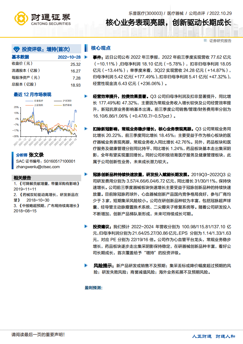 乐普医疗在2022年第三季度展现出强劲的业绩复苏态势,得益于经营效率的提升、有效的成本控制以及核心医疗器械业务的显著增长。公司持续的研发投入和丰富的创新产品管线,特别是心血管领域的创新布局,为其作为行业龙头奠定了长期可持续增长的基础。尽管面临新产品研发、集采和海外拓展等潜在风险,但其稳健的常规业务和创新驱动战略,使得公司未来成长前景值得期待。