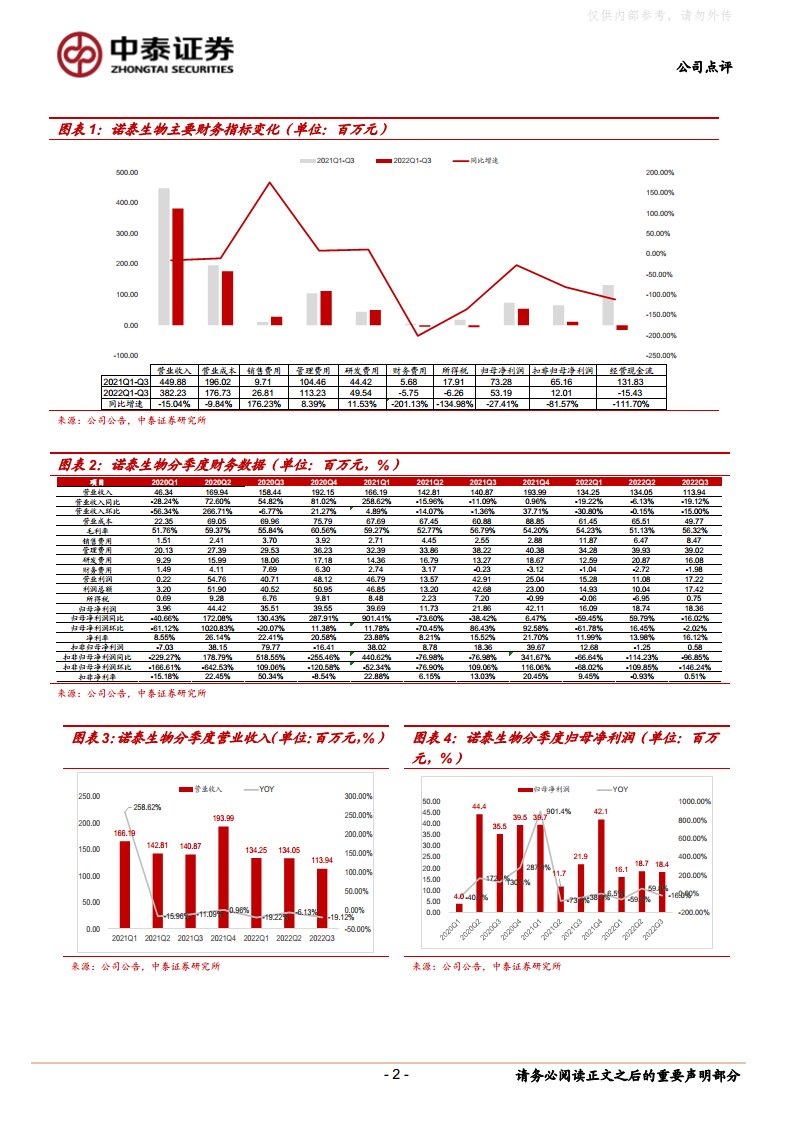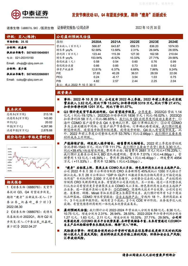 诺泰生物在2022年前三季度面临业绩短期承压,主要受发货节奏扰动和原材料成本上升影响,导致营收和净利润同比下滑。然而,公司正积极通过战略“瘦身”和资源整合,聚焦于核心CDMO业务以及多肽、特色原料药等自主选择产品,以提升盈利能力和市场竞争力。报告预计第四季度业绩有望逐步恢复,并看好公司凭借其技术平台优势和丰富的产品管线,在未来实现CDMO与自主产品双轮驱动的长期增长。尽管存在产能、人才、汇率及原材料等风险,但公司优质赛道和核心竞争力使其仍维持“买入”评级。