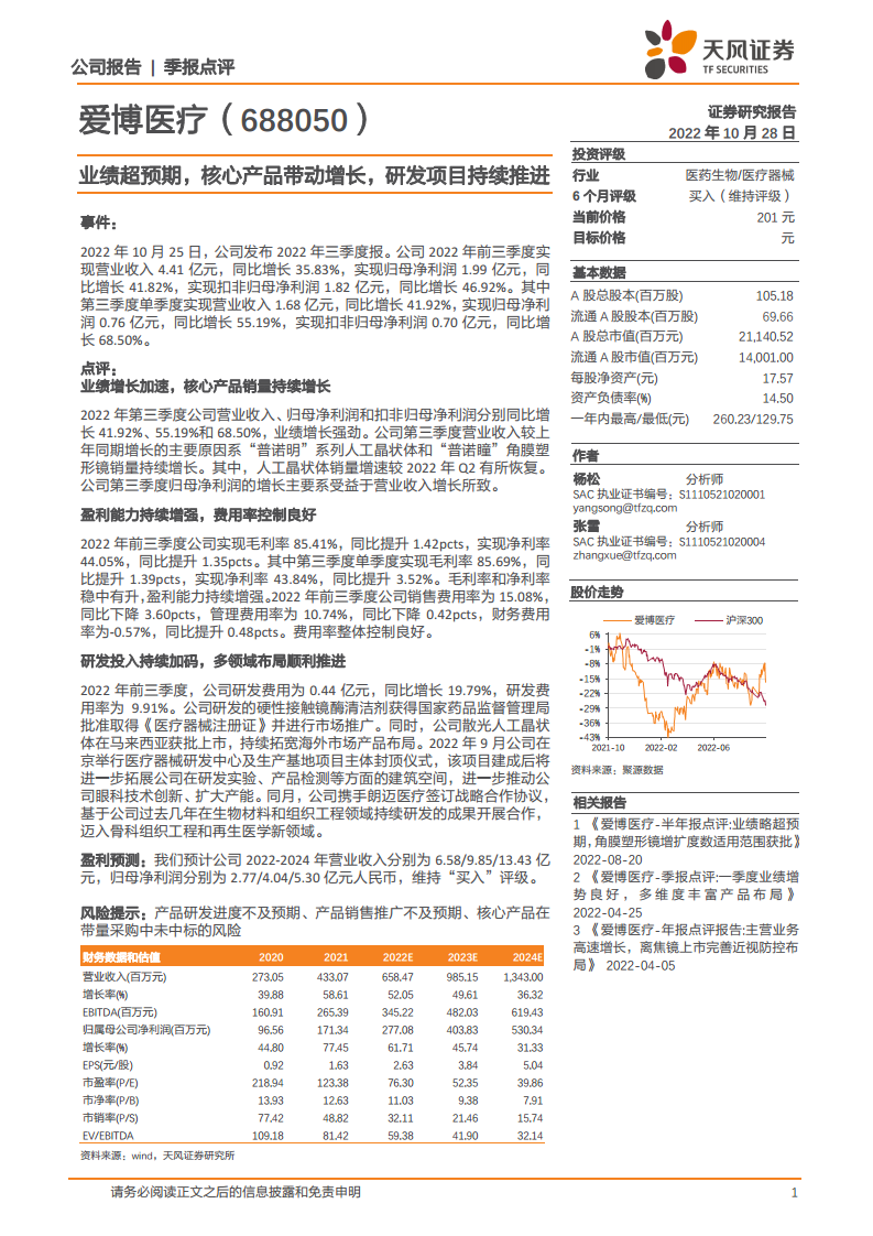 爱博医疗在2022年第三季度表现出色,实现了超预期的业绩增长,核心产品销量持续强劲,是公司营收和净利润增长的主要驱动力。公司盈利能力稳步提升,毛利率和净利率均有所提高,同时各项费用得到有效控制。更重要的是,爱博医疗持续加大研发投入,不仅在眼科领域不断推出新产品并积极拓展国际市场,还通过战略合作成功布局骨科组织工程和再生医学等新兴领域,展现出其在创新和多元化发展方面的决心。鉴于公司稳健的财务表现和积极的战略布局,预计未来增长潜力巨大,维持“买入”评级。