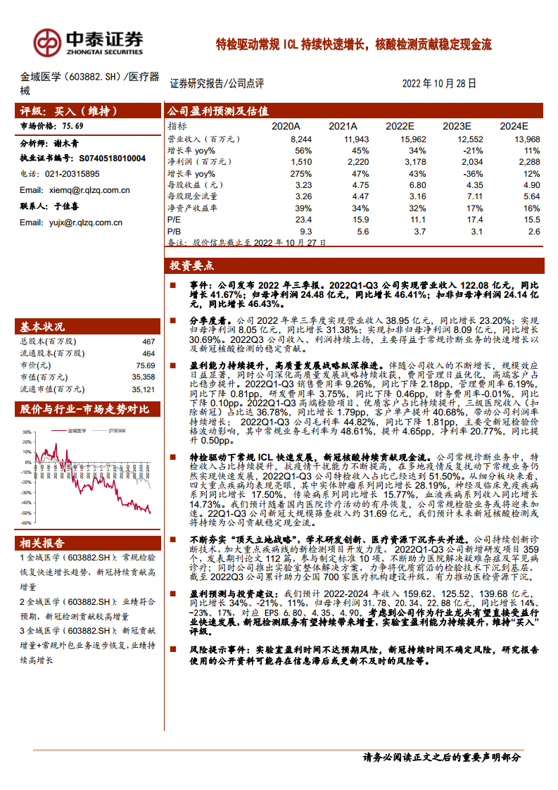 中泰证券研究所预计金域医学2022年至2024年的营业收入分别为159.62亿元、125.52亿元和139.68亿元,同比增长34%、-21%和11%。同期归母净利润预计分别为31.78亿元、20.34亿元和22.88亿元,同比增长43%、-36%和12%。对应的每股收益(EPS)分别为6.80元、4.35元和4.90元。鉴于公司作为行业龙头有望直接受益于行业快速发展,新冠检测服务有望持续带来增量,且实验室盈利能力持续提升,研究报告维持“买入”评级。