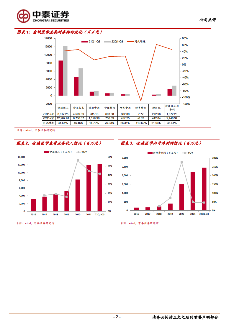 根据公司发布的2022年三季报,金域医学在2022年前三季度实现了营业收入122.08亿元,同比增长41.67%;归母净利润达到24.48亿元,同比增长46.41%;扣非归母净利润为24.14亿元,同比增长46.43%。从单季度来看,2022年第三季度公司实现营业收入38.95亿元,同比增长23.20%;归母净利润8.05亿元,同比增长31.38%;扣非归母净利润8.09亿元,同比增长30.69%。这些增长主要归因于常规诊断业务的快速扩张以及新冠核酸检测业务的持续贡献。