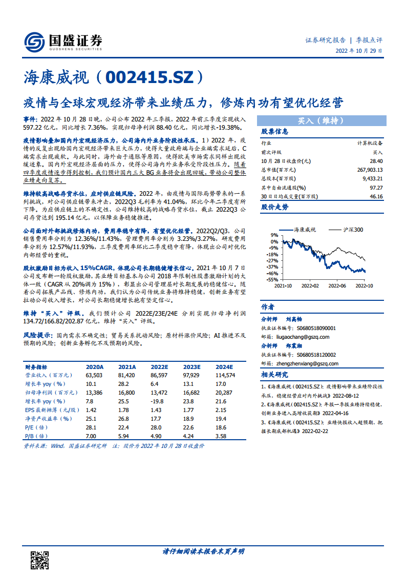 分析师维持对海康威视的“买入”评级。预计公司2022年、2023年和2024年分别实现归母净利润134.72亿元、166.82亿元和202.87亿元,认为随着四季度疫情逐步得到控制,国内三大BG业务有望回暖,带动公司整体业绩走向复苏。