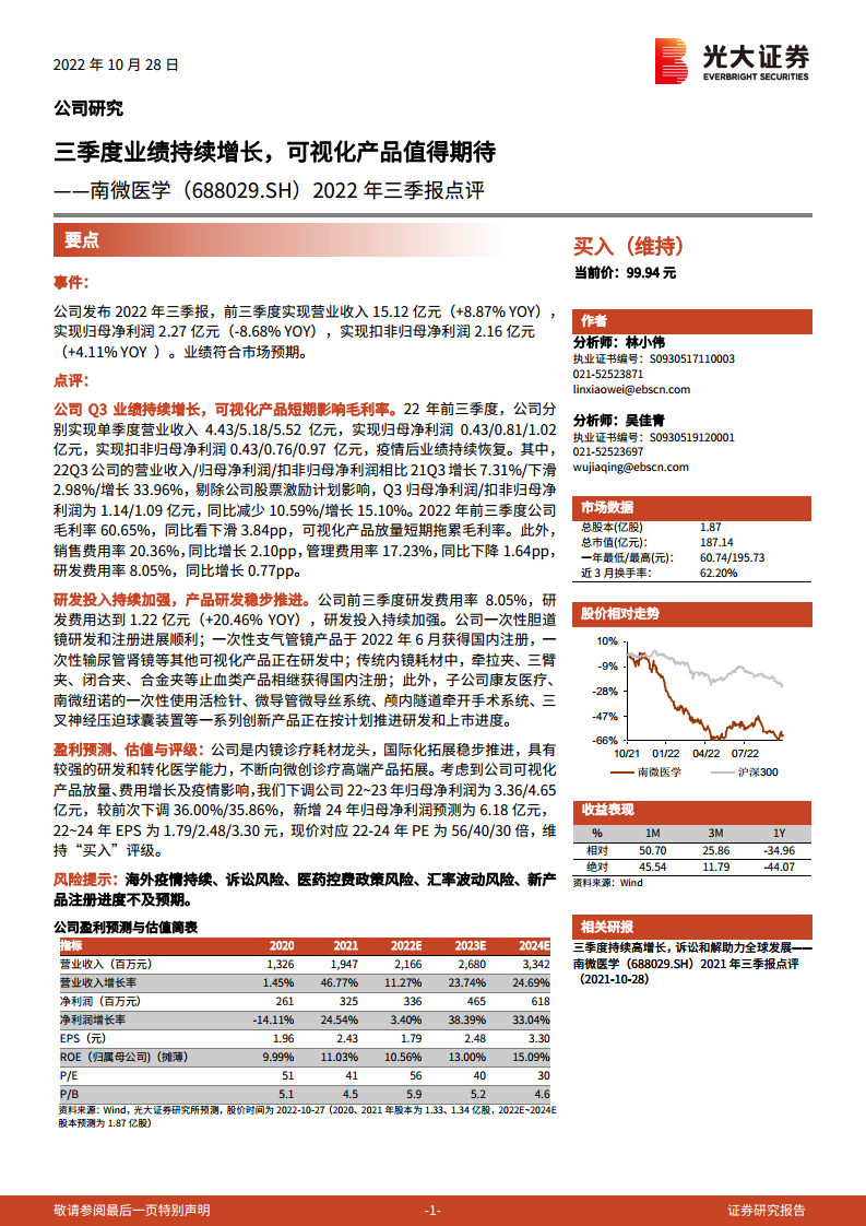 南微医学2022年前三季度业绩表现稳健,营业收入和扣非归母净利润实现增长,符合市场预期。公司持续加大研发投入,特别是在可视化产品和创新医疗器械方面取得了显著进展,为未来增长奠定了坚实基础。尽管可视化产品放量短期内影响了毛利率,且盈利预测有所下调,但公司作为内镜诊疗耗材龙头,其国际化拓展和高端产品布局仍具长期投资价值。分析师维持“买入”评级,并提示了相关经营风险。