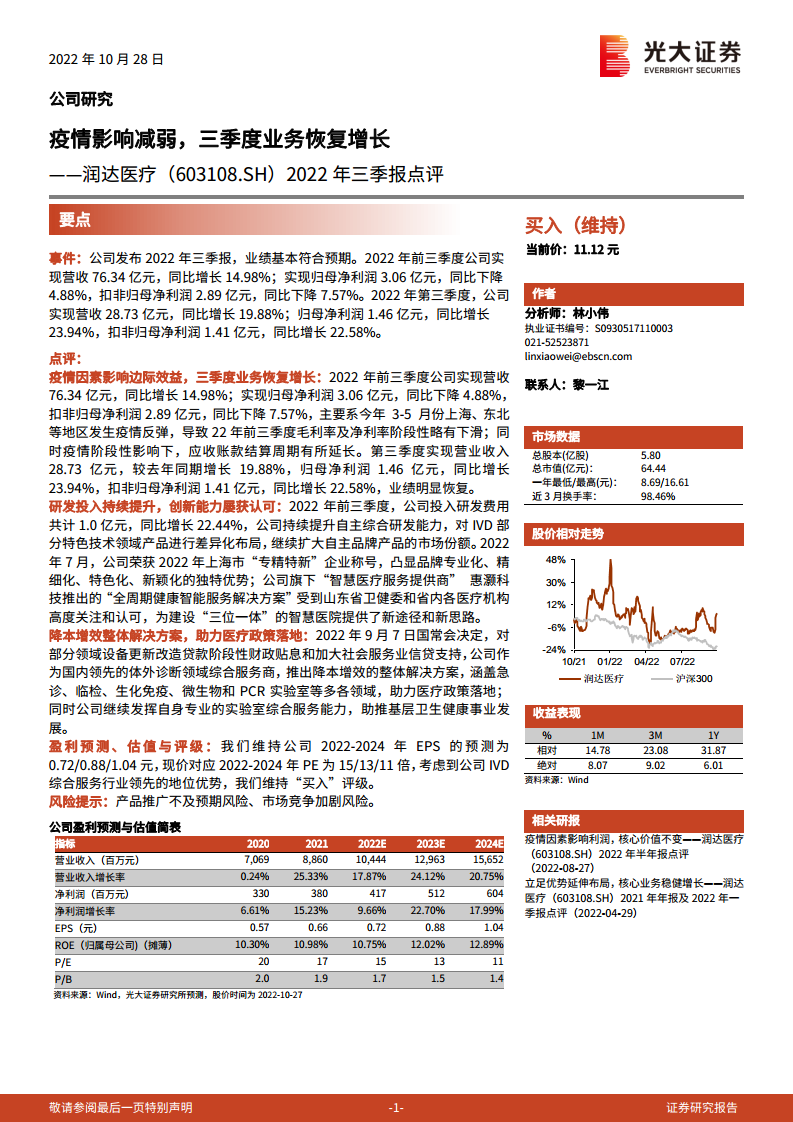 分析师维持公司2022-2024年EPS预测分别为0.72元、0.88元和1.04元,对应当前股价的PE分别为15倍、13倍和11倍。考虑到公司在IVD综合服务行业的领先地位优势,分析师维持“买入”评级。