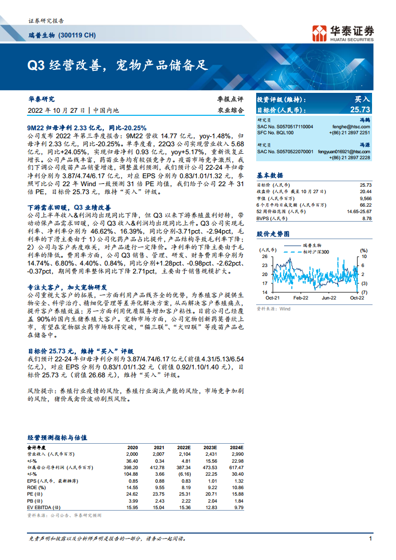 瑞普生物在2022年第三季度实现了显著的经营改善,营收和归母净利润均恢复正增长,这主要得益于下游养殖需求的回暖。公司通过深耕大客户战略,为养殖客户提供全面的解决方案,并积极拓展宠物市场,推出创新药并储备核心疫苗产品,构建了多元化的增长驱动力。尽管疫苗市场竞争加剧导致盈利预测有所下调,但公司在动保行业的深厚积累、对大客户的有效覆盖以及在宠物市场的战略布局,支撑了其长期增长潜力。华泰研究维持“买入”评级,并设定目标价,反映了对公司未来发展的积极展望。
