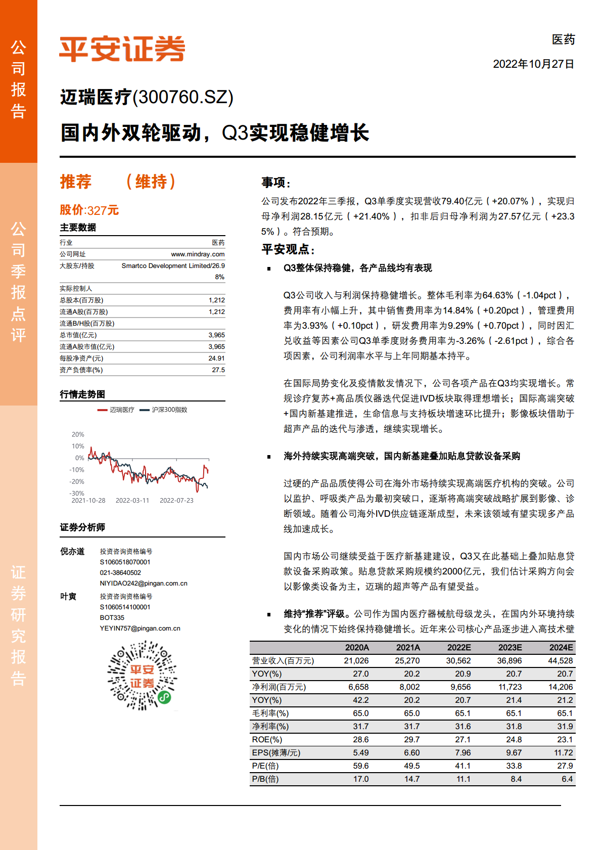 迈瑞医疗(300760):国内外双轮驱动,Q3实现稳健增长