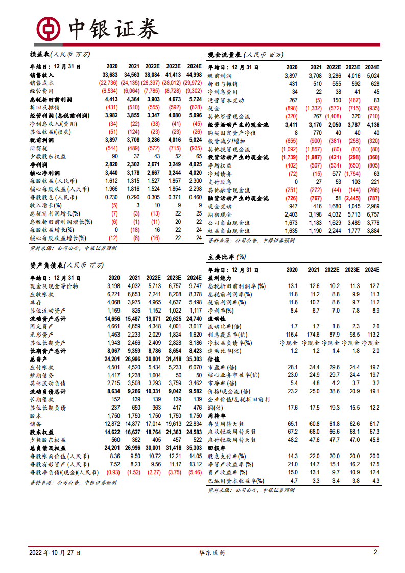 中银证券预计华东医药2022年、2023年、2024年净利润分别为26.71亿元、32.49亿元、40.25亿元,对应EPS分别为1.53元、1.86元、2.30元。基于公司稳健的业绩增长和多元业务布局,维持“买入”评级。主要风险包括产品研发不达预期、汇率波动、销售低于预期以及医保降价等。