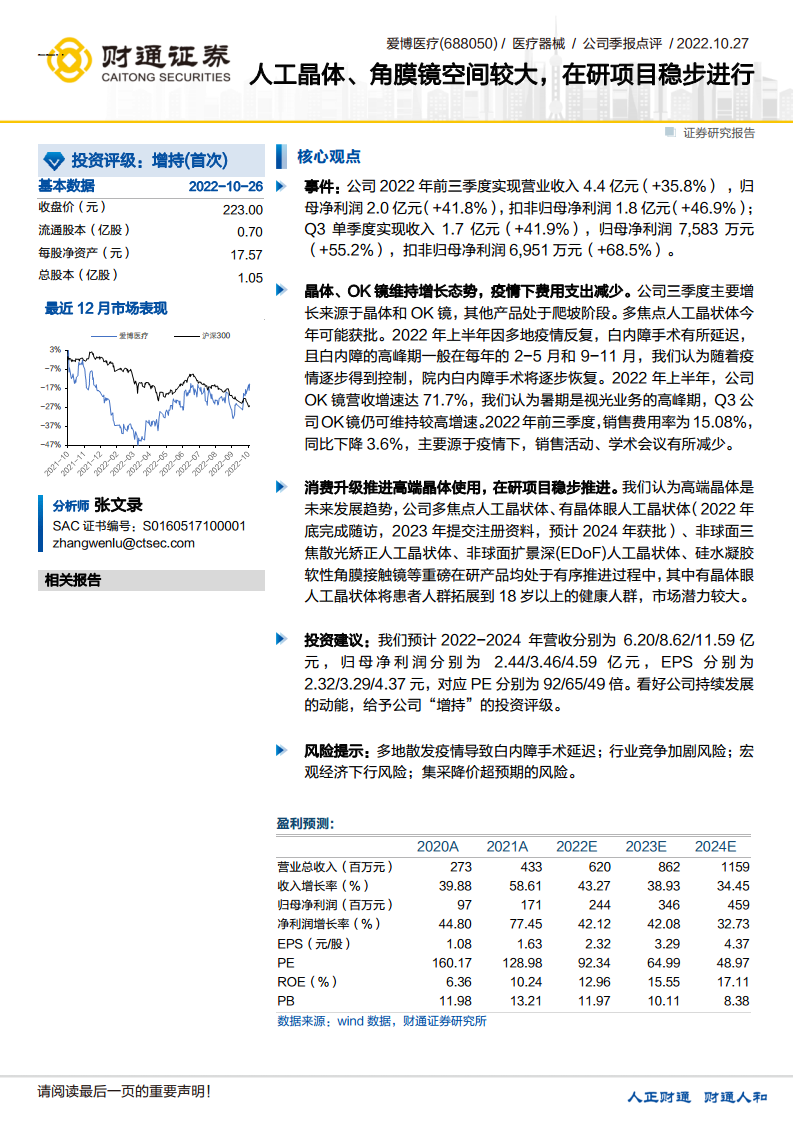 爱博医疗在2022年前三季度展现了稳健的业绩增长,主要得益于人工晶体和OK镜两大核心业务的强劲表现。公司在高端晶体领域的深远布局和多项创新产品的研发进展,为其未来的持续增长奠定了坚实基础。尽管存在疫情、市场竞争和集采等潜在风险,但公司凭借其产品创新能力和市场策略,有望在医疗器械市场中保持竞争优势。基于对公司未来发展潜力的积极预期,财通证券首次给予爱博医疗“增持”的投资评级。